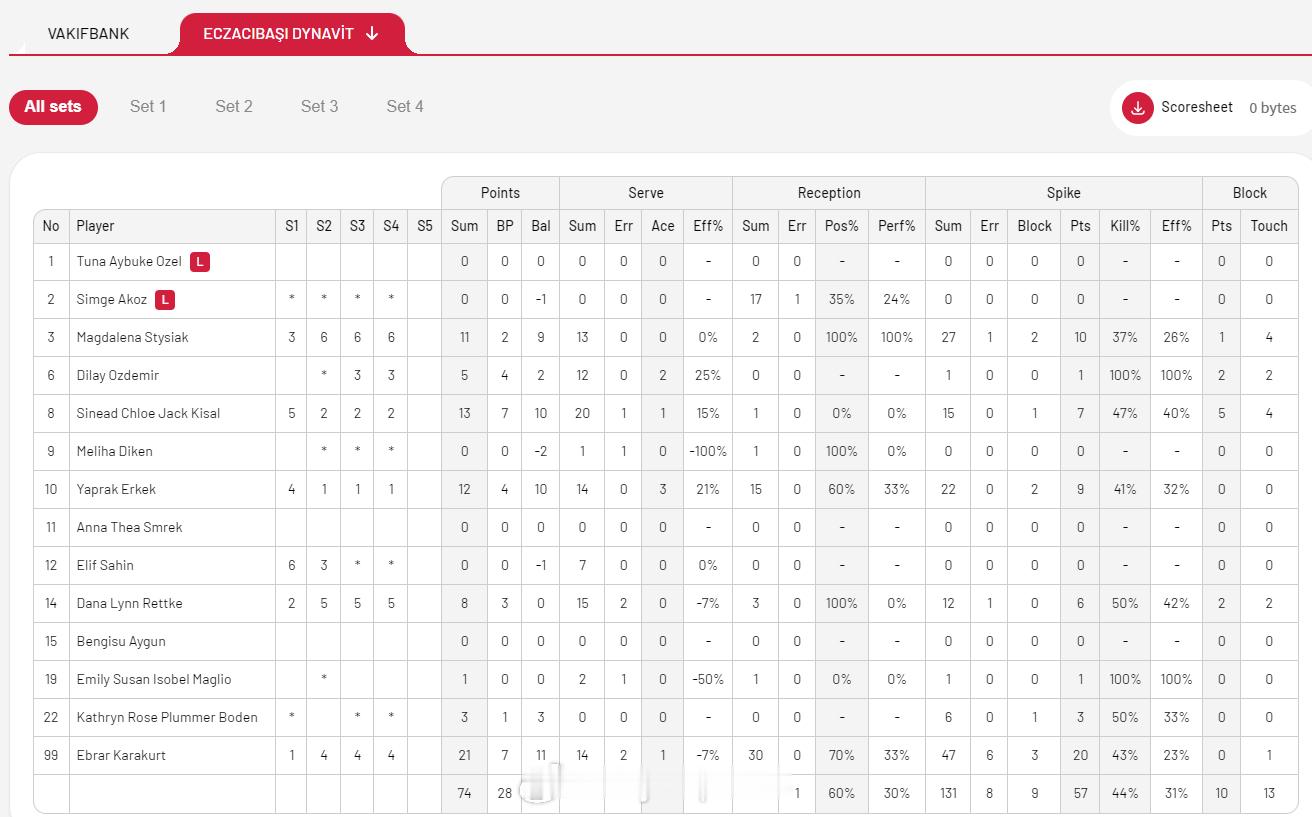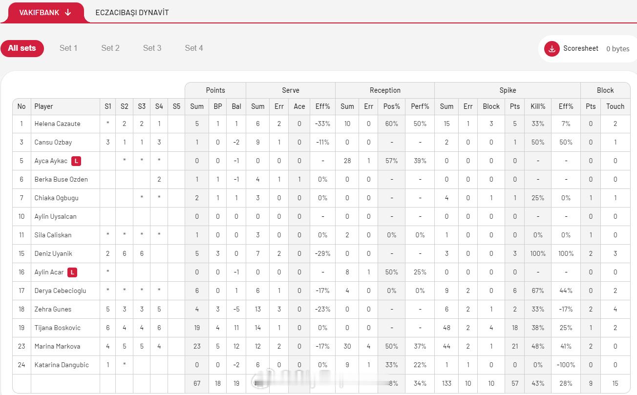 【土超女排瓦基弗1-3不敌伊萨 遭遇联赛首败】国际排坛战报速递 1月18日伊斯坦布尔,土超女排第16轮焦点战,瓦基弗银行主场1-3(18-25/26-24/20-25/18-25)不敌伊萨奇巴希,在15连胜后遭遇首败,不过仍以15胜1负44分排名联赛榜首,伊萨13胜3负列第三。马尔科娃23分、博斯科维奇19分,卡拉库尔特21分、杰克13分、厄尔科克12分、斯蒂西亚克11分。