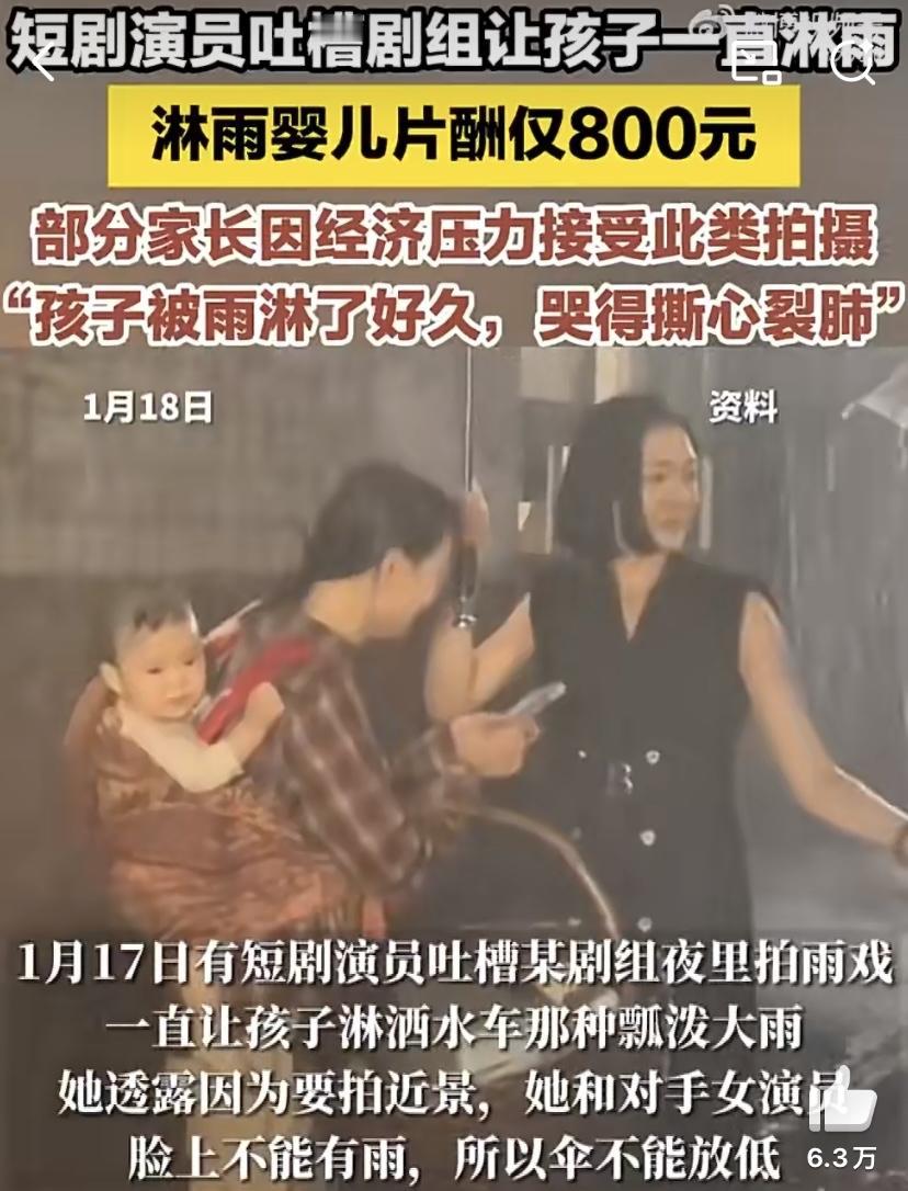 最近有位短剧演员的吐槽让人心疼又气愤,夜里拍雨戏时,剧组让一个小宝宝淋着洒水车喷