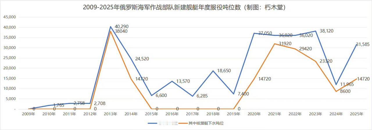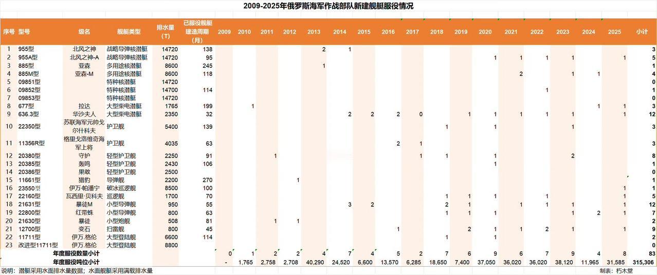 俄罗斯海军,已经退化为一支“黄水”海军。 随着大型舰艇的退役,俄罗斯海军的规模越来越小,呈现出一种“空潜快” 的黄水近岸海军的状态,主要的水面舰艇是一大群1000吨左右小型导弹舰,然后是十几艘战略核潜艇撑门面。在近海建设堡垒海区,确保战略核潜艇的安全,几乎放弃了远海大洋的控制和争夺。 2009-2025年这16年间,俄海军累计服役新舰83艘、总吨位31.5万吨,其中核潜艇占比超55%,清晰呈现“重水下、轻水面”的发展路线。水面舰艇以千吨级小型舰为主,最大仅8500吨破冰巡逻舰,且各型号建造周期普遍偏长,年度服役吨位仅2013年突破4万吨,暴露产能瓶颈。 展望2026-2030年,俄海军计划服役44艘新舰、总吨位25万吨,水面舰占比提升,核潜艇占比降至31.4%。但过往建造拖延的常态,让这一目标能否如期落地打上问号,俄工业链的承压能力将成为关键。