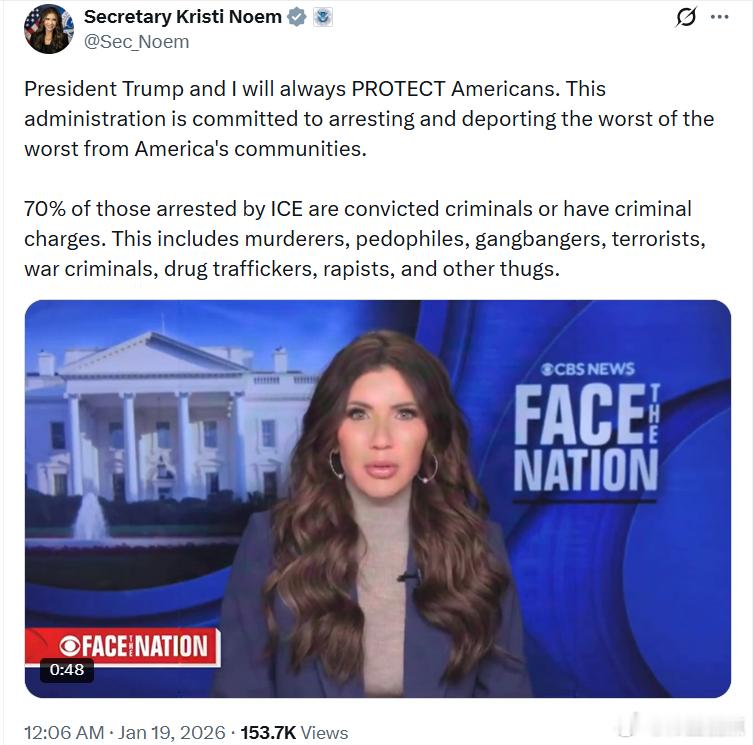 美国土安全部长克里斯蒂·诺姆:特朗普总统和我将始终保护美国人民。本届政府坚定致力于逮捕并驱逐那些对美国社区危害最大的罪犯。ICE逮捕的人中,有70%是已被定罪的罪犯,或正面临刑事指控的人。其中包括S人犯、恋铜癖、黑帮分子、恐布分子、战争罪犯、毒品贩子、强J犯以及其他暴徙。