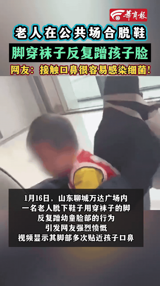 山东聊城万达,一个老人光脚用袜子蹭小孩的脸,还反复往孩子口鼻上贴! 视频里,那两只脚一次次贴近孩子的口鼻脸,孩子懵懵懂懂,甚至不知道自己正在被伤害。 这是谁家的老人,又是谁家的孩子?家长要是看到肯定会生气吧。哪有这样逗孩子的?可能老人觉得无聊,但无聊也不能这样对孩子呀。这已经不是“无聊”,而是拿着孩子的健康开玩笑,是一种故意伤害。但凡一个心理正常的人都不做出这样的行为。 我们的脚每天踩在各种地面上,袜子里藏着真菌、大肠杆菌、灰尘和无数肉眼看不见的病菌。孩子的免疫系统还很脆弱,这些病菌一旦通过口鼻进入体内,可能引发呼吸道感染、皮肤炎症,甚至更严重的疾病。 保护孩子,就是保护我们的底线! 这种坏行为,必须曝光到底!