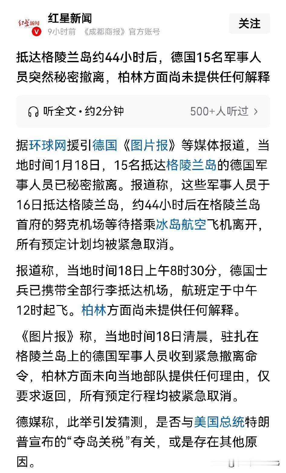 刚“夸”完,欧洲这次为了支持格陵兰岛居然派了兵,还算团结。结果,德国转眼就把士兵撤走了…[捂脸] 虽然欧洲几国派往格陵兰岛的士兵加起来也不到50人,但好歹表明了力挺格陵兰反对美国强占的态度。可德国士兵踏上格陵兰不到48小时就撤了,像极了拍照打卡… 朋友们,你们对此事怎么看? 欢迎大家在评论区探讨,留言…[送心]