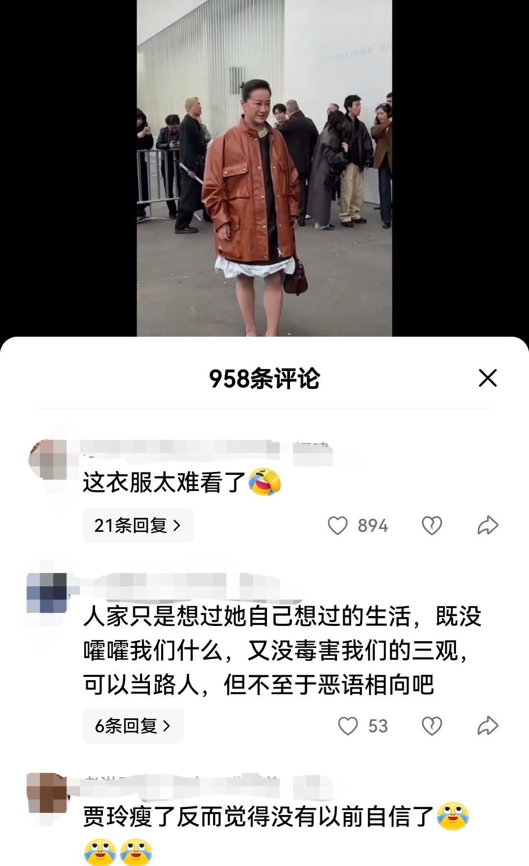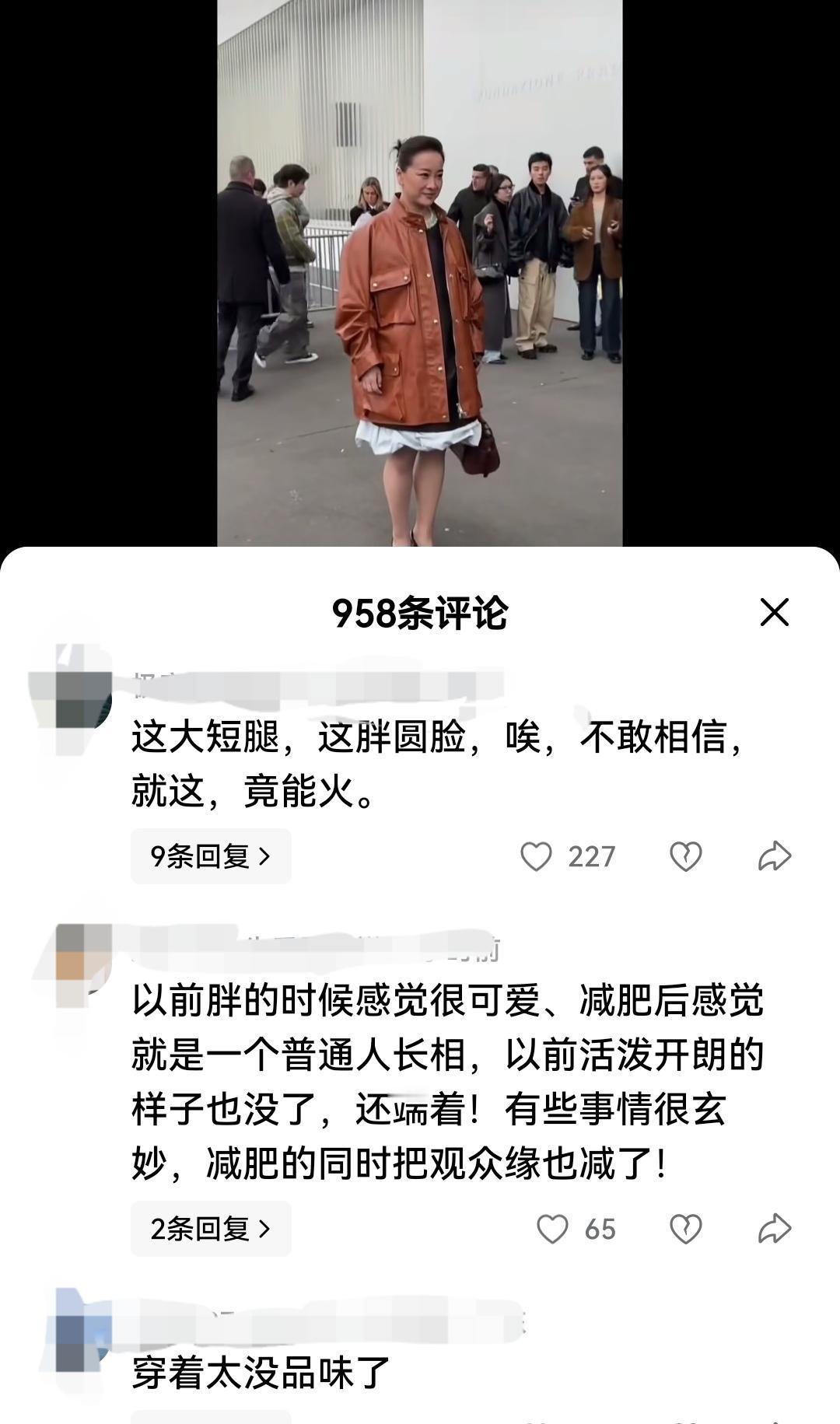 贾玲现身米兰时装周,图中的造型引起了吐槽: 有人说这衣服太难看了……也有人说,这大短腿,这胖圆脸,唉,不敢相信,就这,竟能火…… 还有人说,以前胖的时候感觉很可爱、减肥后感觉就是一个普通人长相,以前活泼开朗的样子也没了,还端着!有些事情很玄妙,减肥的同时把观众缘也减了…… 我想说的是,贾玲的这个造型确实不好看,这样穿不但把腿的缺点露出来了,还给人一种很肥大的感觉,反正就是一言难尽…… 呵呵,贾玲的这身装扮,第一眼看我还以为她是男的呢,你们有这感觉吗? 说到底,这身穿搭不适合贾玲,你们觉得呢?