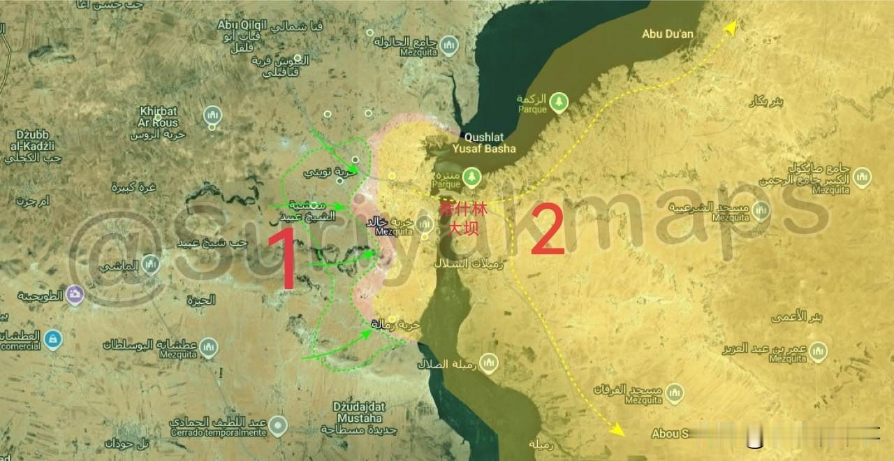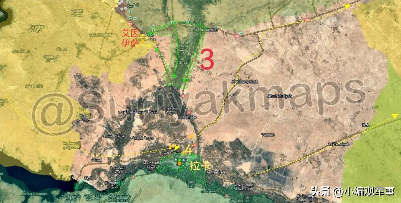 1月18日叙利亚局势: ①库尔德主导的“叙利亚民主军”抵挡了叙利亚过渡政府军对蒂什林大坝的进攻数小时。但在之后,叙利亚过渡政府军在土耳其特种部队的直接支援下得以沿前线推进数公里,控制了优素福·巴沙镇、哈吉·侯赛因镇、基尔巴特·图瓦尼镇和沙什山等地(图一1)。此后,“叙利亚民主军”开始撤离蒂什林大坝,前往科巴尼和拉卡省(图一2)。 ②土耳其支持的“叙利亚国民军”(SNA)开始从拉卡省北部向南推进,占领了“叙利亚民主军”此前遗弃的阵地(图二3)。尽管遭到“叙利亚国民军”的持续攻击和轰炸,但艾因伊萨镇仍在“叙利亚民主军”的控制之下(图二)。 ③在拉卡省其他地区,“叙利亚民主军”已撤退至哈塞克省或继续撤退(图二的黄色虚线示)。随着阿拉伯部落武装的反动叛乱,拉卡省首府拉卡市被占领,但“叙利亚民主军”增援部队迟迟未能抵达。然而,“叙利亚民主军”的零星抵抗力量仍在与叙利亚过渡政府军/部落武装交火,同时得到拉卡市以北第17师军事基地(图二4)和其他军事据点的支援。这种抵抗的目的是争取时间完成全面撤退,并避免前一天(1月17日)在马斯卡纳和代尔·哈菲尔(两地均在阿勒颇省东部)发生的悲剧。 ④阿拉伯部落武装在彻底驱逐“叙利亚民主军”后,完全控制了代尔祖尔省东部地区,而叙利亚过渡政府军则继续在该省油田地区展开部署(图三5)。 ⑤阿拉伯部落武装占领了哈塞克省马尔卡达镇及周边一系列城镇(图三6)。之后他们短暂占领沙达迪镇,但随后“叙利亚民主军”发起反击并重新夺回了该镇(图三)。 图四为截止1月18日的叙利亚局势图。