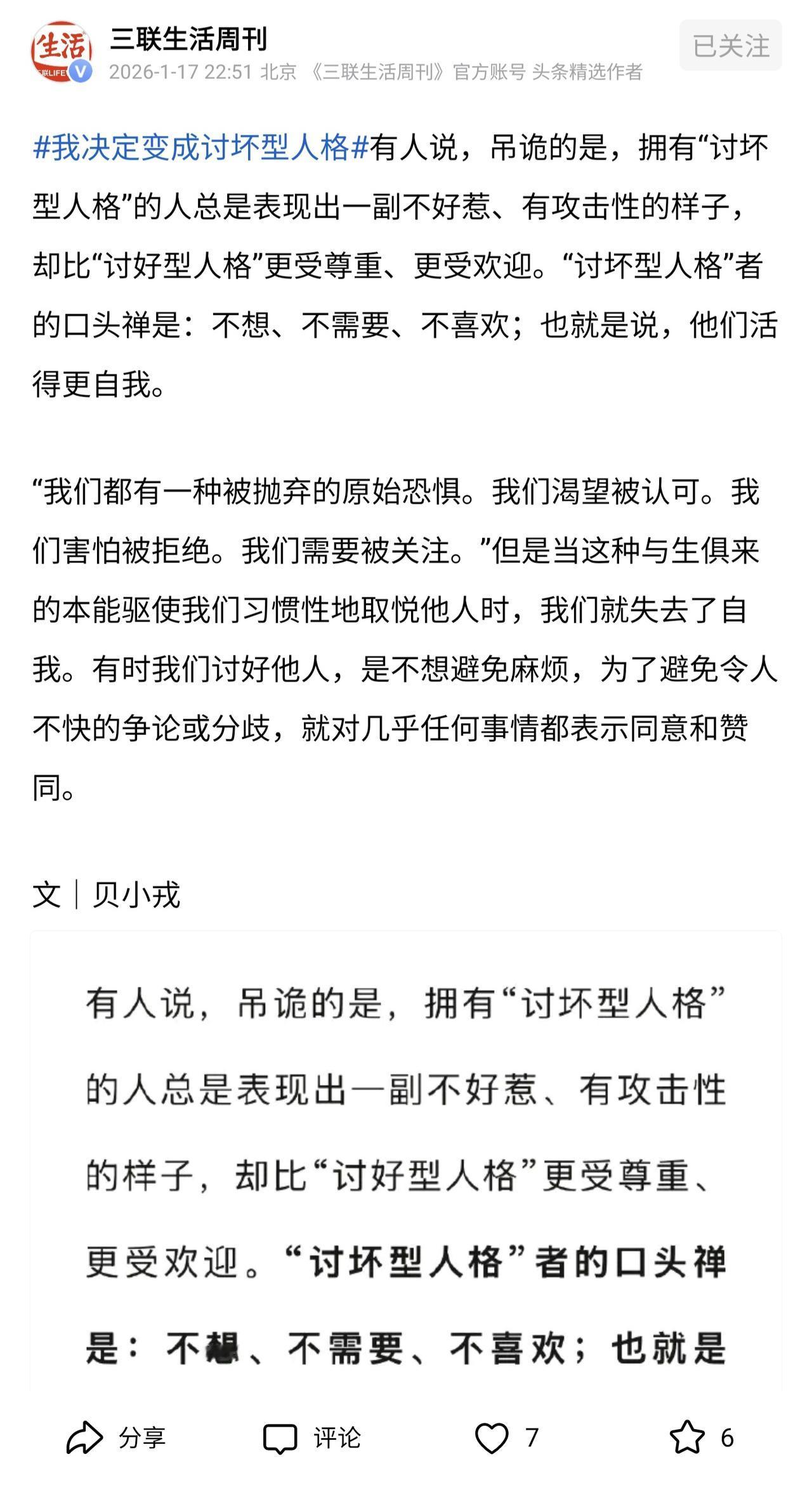 有锋芒的善良才会被珍惜和尊重,刷到一则新闻,讲的是一种很吊诡的心理现象,不好惹、有攻击性的“讨坏型人格”比讨好型人格更受尊重、更受欢迎。 想起前天跟朋友一块爬山时候的闲聊,朋友经常锻炼,身体素质明显高于普通人。我说这个世界有个很有意思的事情,你对自己“残酷”一些,比如说让身体感觉到痛苦的自律和锻炼,但身体会给你正面健康的反馈,如果你经常让身体感觉到舒服和安逸,身体反而带来种种疾病,尤其经常喝酒,常坐不动的,三高都来了。 如果把这种法则应用到社会交往层面一样,我们从小被教育要合群、友善。但你会发现如果你对这个世界处处讨好,反而让别人觉得你理所应当,你的善良行为反而成了廉价品。如果你对这个世界“残酷”一些,世界反而会给你温柔的反馈,别人反而会尊重你,因为免费的东西总让人感觉质量有问题,随叫随到的善良自然让人觉得廉价。 当然并非鼓励大家不善良,而是要让你的善良变得有价值。在今后的一段时间尝试,以自己的工作为中心,做好自己的分内事情,不要因为拒绝别人担心影响人际关系,也许你会发现,那些值得你维系的关系不会因为拒绝离开你,因为成年人的社交本质就是价值交换,坚持自己价值提升,世界就会给你正向反馈。
