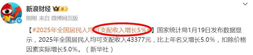 重磅利好:去年人均可支配收入增长5%! 来自国家统计局最新数据:2025年全国居民人均可支配收入43377元,比上年名义增长5.0%,扣除价格因素实际增长5.0%。四个字总结大抵就是:稳中向好!