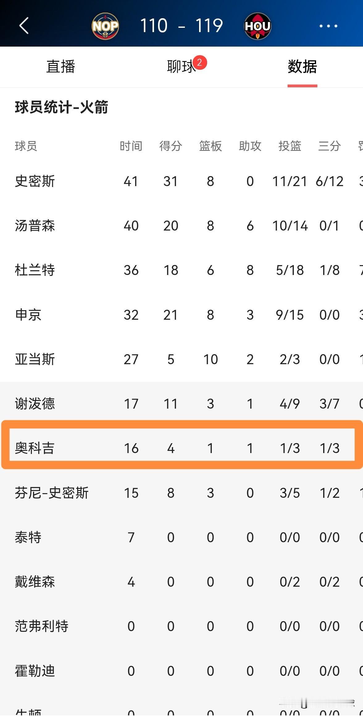 我强烈建议火箭大将奥科吉提升自己的三分投射能力!在今天火箭主场以119:110力克鹈鹕的比赛中,奥科吉再次在三分线外失准,他在替补出战的16分钟里,三分球3中1,其中罚球2中1得到4分1篮板1助攻1盖帽,他的场上正负值为-1。 坦白说,如果奥科吉想要在火箭站稳脚跟并且想要签下一份大合同的话,那么奥科吉必须把三分球练出来,不然的话他的下一份合同很有可能还是一份底薪合同。