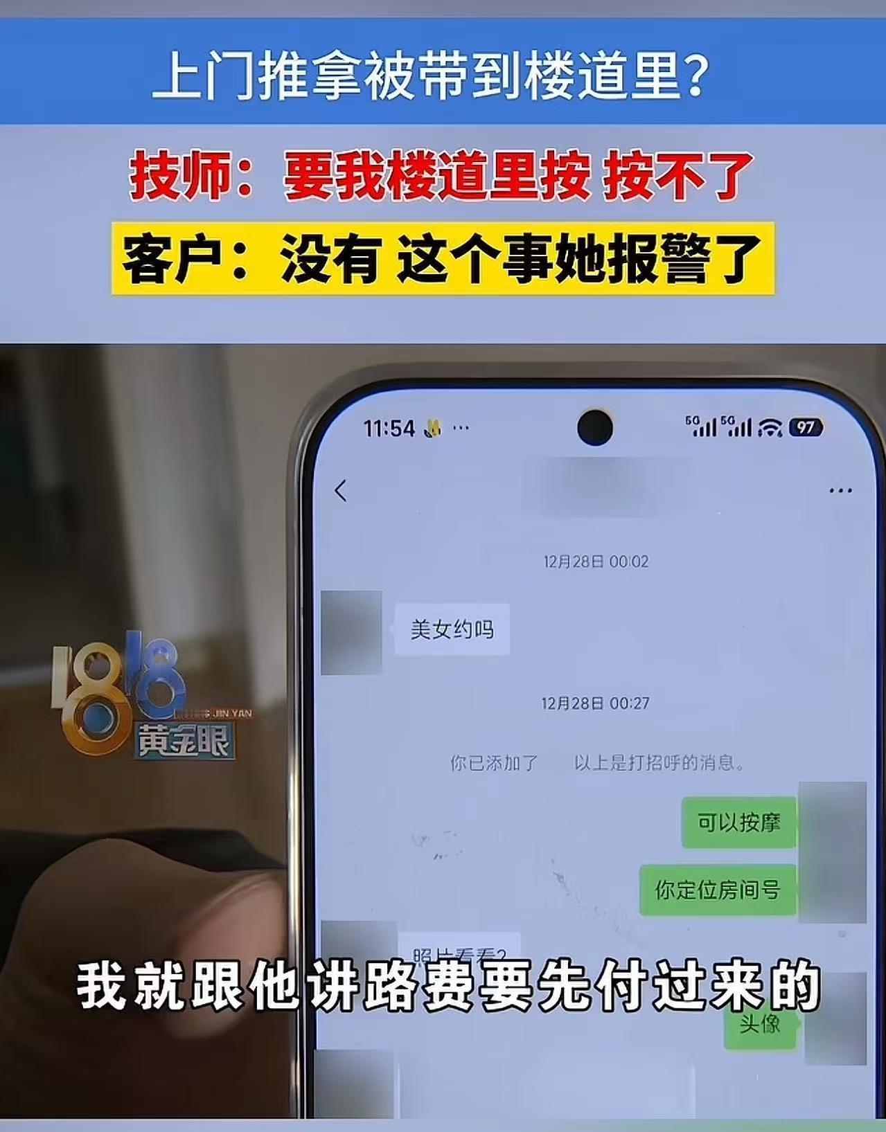 🌙凌晨,按摩女上门推拿,被客户带到楼道里?按摩女:“他说老婆在家里不方便,让我在楼道里按,我说按不了,让他给我路费,他不给我路费。”客户:“不是她说什么就是什么,我觉得她是不正规的按摩,就不想按了!” 那天是2025年12月28号凌晨,天寒地冻,徐女士只穿了件薄外套,肩上背着死沉的按摩箱,大老远跑这一趟。结果对方扔下一句“不按了”,扭头就要撤? 她只好提出最基本的要求:“那你至少给我来回路费吧!”谁承想这男的张嘴就是个:“滚!” 被逼无奈,徐女士拿出手机准备拍摄。那男的一瞅要留底,顿时慌了神,迈开步子就逃。徐女士一路追到了电梯口,对方居然挥起拳头就要动手!她下意识地往后一闪,腰猛地扭了一下,当场就伤着了。 之后去医院看病花了四五百块钱,回头找他赔偿医药费?人家根本就不承认! 头一回调解的时候,警察劝大家各退一步,徐女士把视频删了,那男的掏了40块钱算是息事宁人。但后来腰伤越来越厉害,她只好二次报警。这一次,警方已经正式立案展开调查。 最让人火大的是,这男的居然反咬一口:“我一看她不像正规的,就不按了。她狮子大开口要500块,我没同意,她就报案了!” 徐女士气得当场把工具箱摊开,把专业设备一件件亮出来:“我干的是正经工作,我不是那种人!”看明白没有?这事儿根本不是徐女士职业是否正规的问题,纯粹是那个男客户心理扭曲! 他彻头彻尾都在利用大众对女性服务业的刻板印象:既然你是女的,又干按摩,还半夜上门,那你绝对“不正经”——所以我能赖账,能羞辱你,甚至能动手揍你! 可大伙细想一下,倘若换个男师傅上门修电脑、通马桶,哪怕是大半夜去客户家里,谁会怀疑他“不正规”? 千万别拿“穿得少”、“凌晨上门”这种标签来遮掩核心真相:徐女士付出的是有偿劳动,而客户是在企图用“不正规”这套说辞来逃单,甚至升级成言语攻击和肢体威胁! 更得让人警醒的是,这男的藏在“老婆在家”这个幌子后面,暴露的压根不是什么顾虑,而是对规则的无视以及对劳动者的践踏。 他觉得徐女士软弱可欺,只因她孤身一人。他认定她不敢把事闹大,只因觉得她的职业“见不得光”。然而,徐女士凭着一部手机、一张病历单、一份报警回执向所有人宣告:我的劳动值得尊重,我的身体不容冒犯,我的尊严不该打折! 法律绝不该只庇护那些“看起来光鲜”的人,更得守护那些在深夜街头依旧靠双手讨生活的普通百姓。 各位看官,你们觉得这男的是真心觉得“不正规”,还是打一开始就在设局?欢迎在评论区唠唠你的看法!