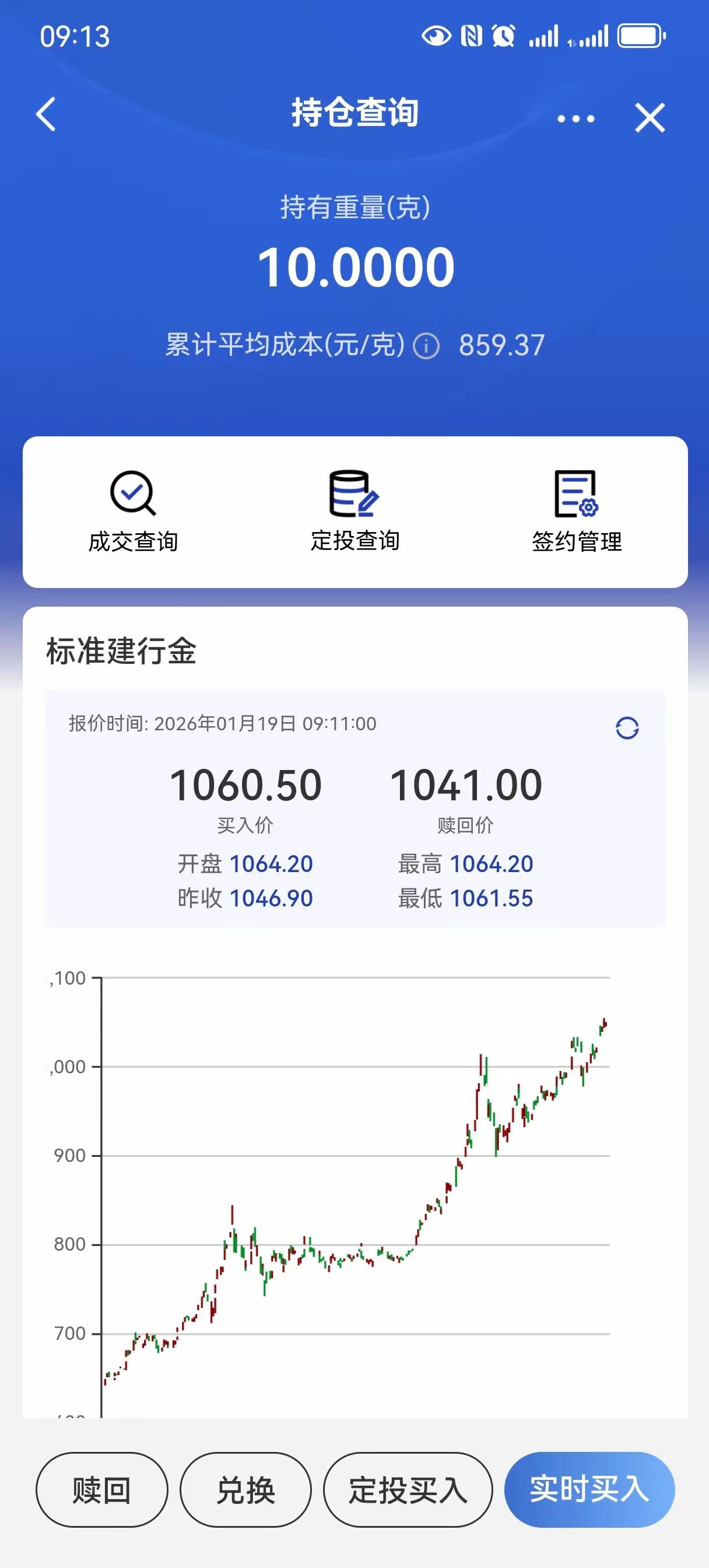 黄金真不是普通人玩的了么? 真是让人心惊肉跳的。我不想它了。 上周大跌,恐慌的在1035全赎回了。而跌到1020附近时幻想还会不会下跌,机会瞬间失去。 今早9点40时,打开手机,建设银行积存金由周五的1035直接跳涨到1048了。 怎么总是歇两天就暴力拉升呢?真受不了。 其实今早跳的开盘最高到了1064了。照这样的涨势,莫不是春节前就想到1200? 大家怎么看?