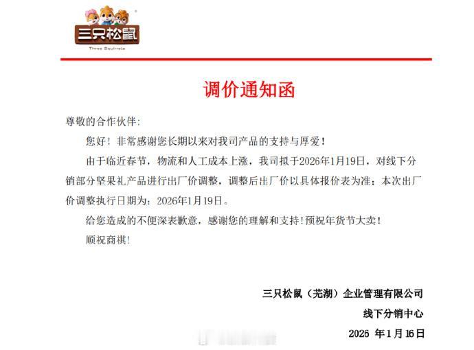 三只松鼠近日对其线下分销渠道的部分坚果礼产品进行出厂价上调,新价格自1月19日起生效。此次是在春节销售旺季前的调价动作,你怎么看?