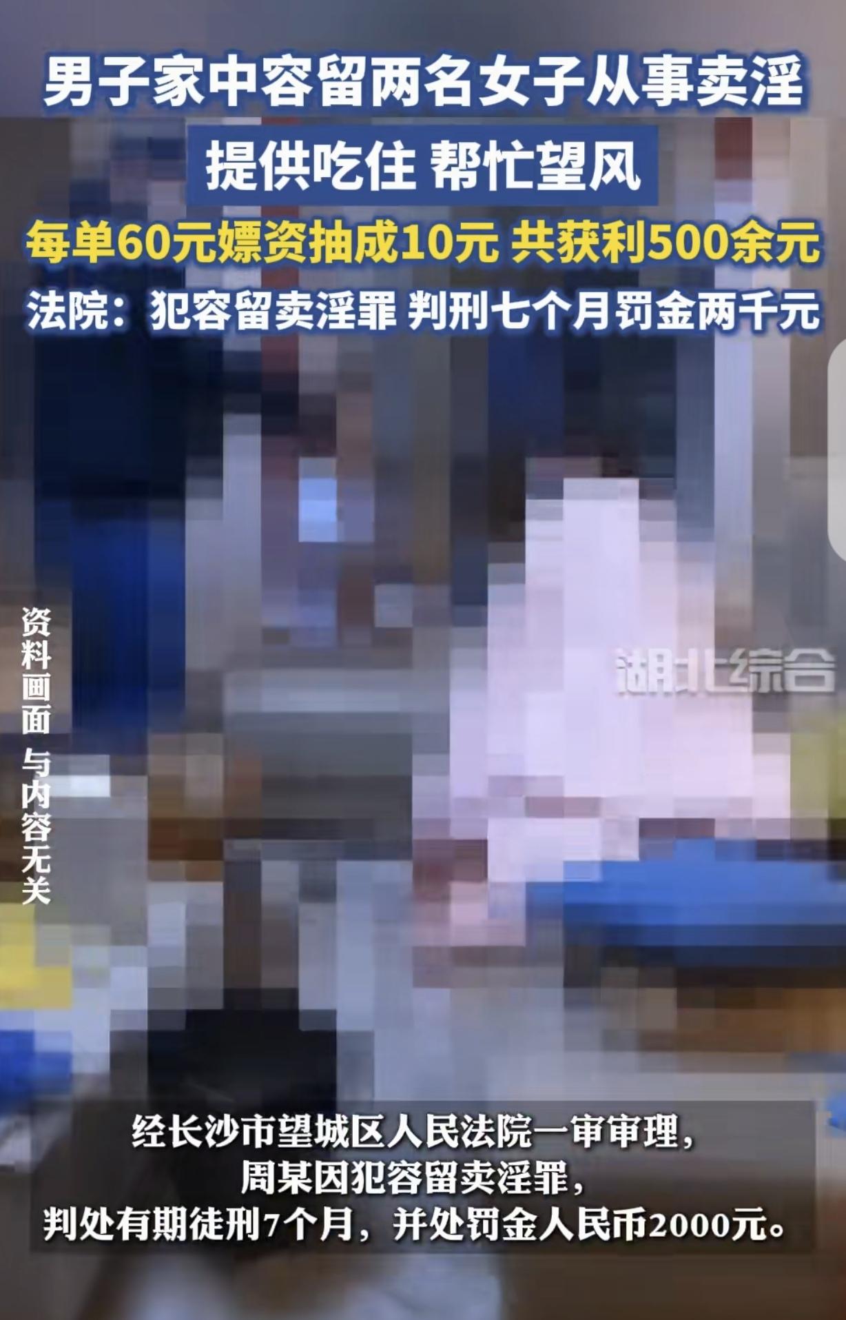 “赔了夫人又折兵!”湖南长沙,一男子在家容留2女子从事非法活动,不但提供吃住,还帮忙望风,每单60元,他才抽10元,一共挣了500元后东窗事发,他被判刑7个月,还被罚款2000元,男子肠子都悔青了。 据1月18日棒女郎在行动报道,周某是无业游民,不是他找不到工作,而是因为太懒,总想天上掉馅饼的好事。 这年头,只要肯吃苦,养活自己轻而易举,但周某高不成低不就,工资高的工作,他觉得太累,压力也大,工资低的工作,他又看不上眼。 所以,他每天游手好闲,就想找一个旁门左道的营生,既不辛苦出力,也能吃香喝辣。 就这样,周某认识了“失足女”邹某和李某,3人臭味相投,很快达成一致。 周某没来钱道,而邹某和李某又没场所,他们各取所需,就商量好了,在周某家从事非法活动,每单给他提成10元,但必须管吃管住,他还得帮忙望风。 周某在心里一番盘算,觉得有账可算,虽然每单才10元提成,看着不多,但两个女子如果每天多接几单,就有钱拿了。 周某认为,反正自己房子空着也是空着,又不影响自己住,就当租给邹某和李某了,抽成就当租金了。 至于吃饭,两个女人也吃不了多少,花不了多少钱,望风也是应该的,她们出事了,自己也得受牵连。 于是,2025年3月,3个人一拍即合,可周某7个月,也就获利500多元。 而让他万万没想到的是,10月份的一天,其中一个女子交易时,竟然被警方抓获,拔出萝卜带出泥,周某也被控制。 最终,周某被判处有期徒刑7个月,还被罚款2000,只挣了500多元,却付出这么大代价,估计他肠子都悔青了。 贪小便宜吃大亏,违法营生不可为。周某就完美诠释了这句老话。 他因为懒惰,不愿吃苦工作,竟想出在家容留“失足女”从事非法活动来赚钱,结果只获利500多元,就被判刑7个月,还被罚款2000元,这教训不可谓不深刻。 周某本是个四肢健全的成年人,在这个只要肯努力就能养活自己的时代,他却好逸恶劳,高不成低不就。工资高的工作嫌累、压力大,工资低的工作又看不上,整天游手好闲,妄图天上掉馅饼,找个不辛苦又能吃香喝辣的旁门左道营生。 这种心态,就是他走向违法犯罪道路的根源。他不想付出努力,却妄想收获财富,天下哪有这样的好事? 当他认识了“失足女”邹某和李某后,三人臭味相投,一拍即合。 可他没想到,这种看似“划算”的买卖,实则是把自己推进了火坑。 从法律角度来看,周某的行为严重违反了法律法规。 容留他人从事非法活动,本身就是一种助纣为虐的行为,为违法犯罪提供了温床。 他以为自己只是抽点提成,没什么大不了,却不知道这种行为已经触犯了法律的红线。 法律是公平公正的,不会因为他的获利少就对他网开一面。无论获利多少,只要实施了违法犯罪行为,就要受到法律的制裁。 从道德层面来讲,周某的行为也是极不道德的。 他为了自己的私利,不顾社 会公序良俗,纵容“失足女”在他人家中从事不正当交易,破坏了社 会的风气,给周围的人带来了不良影响。 这种只考虑自己,不顾他人和社 会利益的行为,是自私自利的表现,必然会遭到社会的唾弃。 周某的结局是可悲的,但也是他咎由自取。他原本可以靠自己的双手,通过正当的劳动去创造美好的生活,却因为懒惰和贪婪,选择了这条违法犯罪的道路。 他的经历给我们敲响了警钟,让我们明白,在生活中,我们不能贪图小便宜,不能妄图走捷径,更不能触碰法律的红线。 只有脚踏实地,通过自己的努力和付出,才能获得真正的幸福和成功。 同时,我们也要加强法律意识,明白什么能做,什么不能做,做一个知法守法的好公民。 周某的行为已触犯《刑法》第359条规定:引诱、容留、介绍他人卖淫的,处五年以下有期徒刑、拘役或者管制,并处罚金;情节严重的,处五年以上有期徒刑,并处罚金。 从案件事实看,周某为邹某、李某两名卖淫人员提供自家住所作为卖淫场所,还负责管吃管住和望风,每单抽取提成,完全符合该条款中“容留他人卖淫”的构成要件。 容留二人以上卖淫就应当定罪处罚,不以获利多少为唯一标准,周某虽仅获利500余元,但容留人数已达标,满足刑事追责条件。 法院判处其有期徒刑7个月、罚金2000元,正是在五年以下有期徒刑、拘役或者管制的法定量刑区间内,结合其获利少、未造成其他严重后果等情节作出的适当裁决,体现了法律对容留卖淫行为的零容忍,也警示任何试图通过助长非法交易获利的行为,都会受到法律制裁。 关注@灋律盐究员 学法辩是非,用法止纷争。