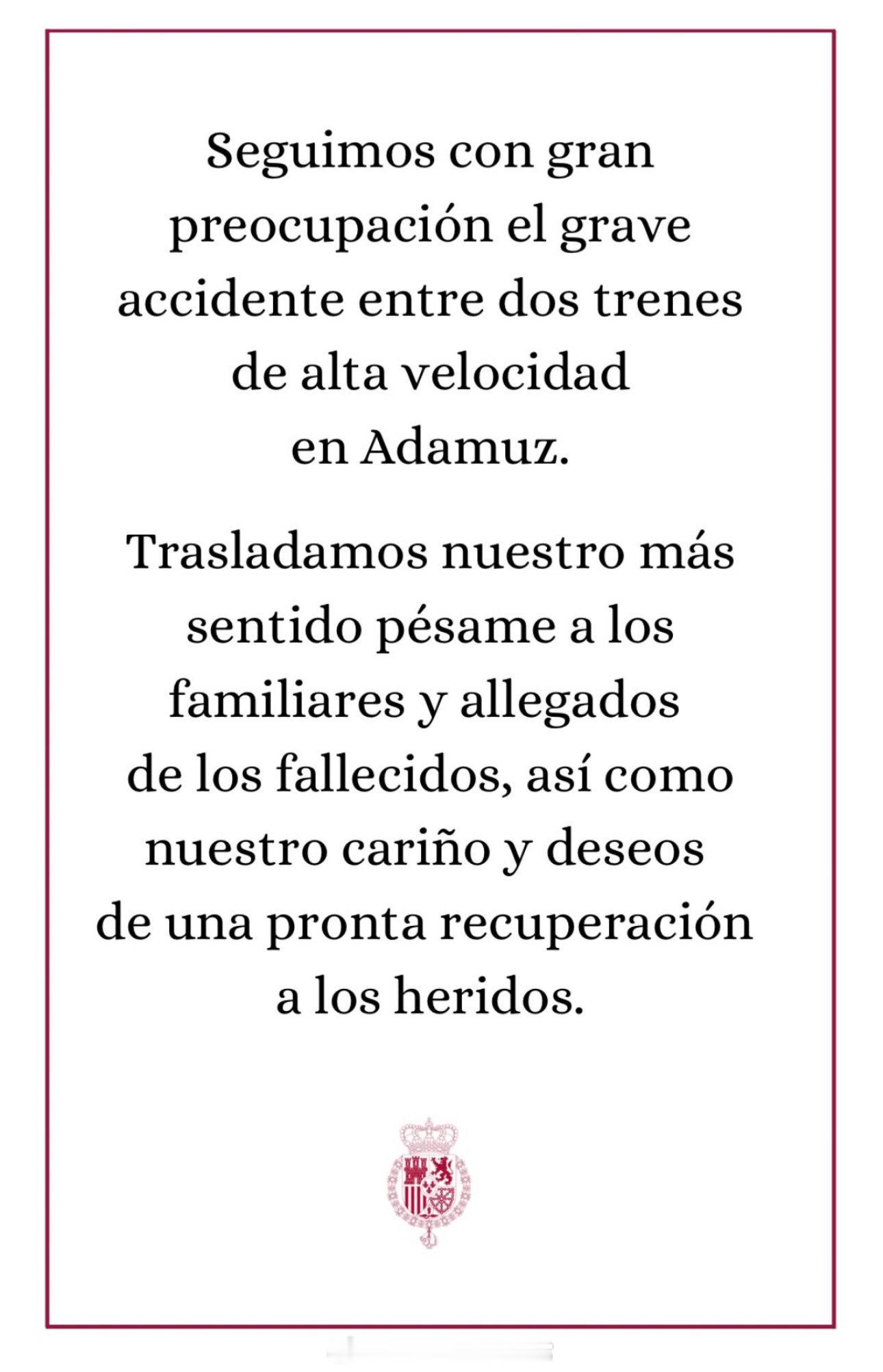 当地时间18日晚,在西班牙科尔多瓦省发生两列高速列车脱轨相撞事故西班牙高速列车相撞事故已致21死 ,casa real向遇难者家属致慰问信。事故发生的时候他们一家已经在去希腊的途中了,应该葬礼结束后就会回国(不知道还会不会参加后面在塔托伊的仪式)。这周费莱的工作安排十分密集,包括颁发美术金质奖章、出席FITUR开幕式、以及外交招待会等,不知道会不会有调整。