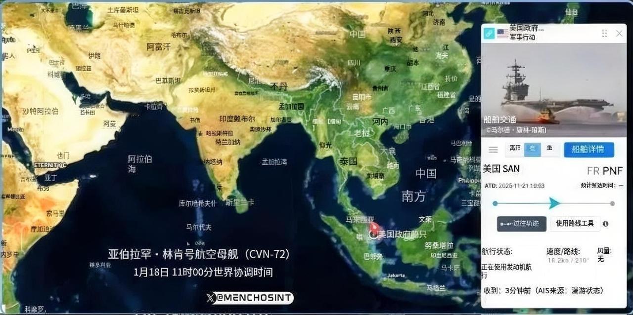 根据最新的船舶跟踪信息显示,美国林肯号航母搭载第9舰载机联队与海军陆战队首个F-35C中队现在已经离开南海,穿过了马六甲海峡,继续前往中东。 1月14日,美国五角大楼下令林肯号航母从印太司令部辖区转隶中央司令部,以填补中东地区航母的部署空白,威慑伊朗、支援以色列,应对地区紧张局势升级,为可能的军事行动提供空中支援与海上控制能力。 照这个速度看,还是很着急赶路的,预计1月20-21日就会进入阿拉伯海,可随时前出波斯湾或阿曼湾执行任务。 林肯号航母进入美中央司令部责任区 美国林肯号航母加速驶往中东