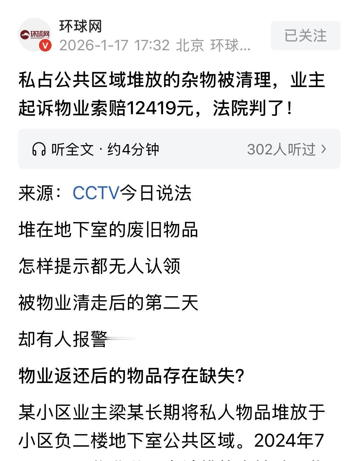 广西南宁,男子喜欢囤废品,他把小区地下室当成自家仓库,长期堆放杂物,又臭又有安全隐患,物业要求男子清理无果后,直接让人上门全部回收了,男子气得报警,物业只好又把废品全部送回来,可男子非说东西少了,拒绝收货,物业也不惯着,又把废品全部送到回收站,男子这下不干了,直接诉至法院,向物业索赔财产损失12419元。结局哭笑不得! 老梁这人有个习惯,特别爱攒东西,而且,他爱往公共区域堆垃圾。 他家在负二楼地下室,本来是大家停车或者通风的地方,结果被老梁长期霸占,堆满了他家的私人物品。 啥旧家具、破纸箱、瓶瓶罐罐堆得满满当当,跟个废品收购站似的,惹得其他业主哀怨声连连。 这事儿物业肯定得管。2024年7月19号,物业贴了张条子在老梁那堆破烂墙上。 条子上明确写了:这是公共地方,堆东西不仅脏,还容易着火,赶紧在7月23号之前弄走。要是到时候还没动,我们就当没人要的垃圾给处理了。 话都说到这份上了,正常人早就动手搬了。可这老梁却毫无动作,他只当物业就是吓唬吓唬人,哪敢真动他的东西? 他压根没当回事,一样也没搬。 结果到了8月18号,物业一看,好家伙,给你脸了是吧? 他们也没跟老梁客气,直接叫了个收废品的上门。所有废品一锅端,全给拉走卖给旧货回收站了。 第二天,老梁去地下室一看,傻眼了!我那堆宝贝呢?他这下急了,赶紧报警,说物业偷他东西。 警察一介入,物业那边再不乐意,也还是配合着把东西从回收站拉回来了,又给老梁送了过去。 按理说这事到这就该结了,人家把东西给你送回来了,你签收了不就完了吗?可老梁不干。 他跑过去一看,觉得东西好像少了几样,反正就是不满意,脖子一梗,大喊我不收!你们弄丢了东西就得赔! 物业一看这架势,也是无奈,你不收是吧?行,又给拉回旧货店了。 这一来二去,老梁越想越气,觉得自己吃了大亏,一纸诉状把物业告到了法院,要求物业赔偿他12419块钱。 到了法庭上,这老梁的算盘打得噼里啪啦响。 他觉得:第一,那是我的私人物品,你们凭什么动?第二,东西少了,你们得赔。第三,我那些宝贝都是好东西,值1万多呢! 那从法律角度,怎么看这场纠纷? 《民法典》第286条规定:业主应当遵守法律、法规以及管理规约,相关行为应当符合节约资源、保护生态环境的要求。对于损害他人合法权益的行为,业主大会或者业主委员会,对任意弃置垃圾、侵占通道等损害他人合法权益的行为,有权依照法律、法规以及管理规约,请求行为人停止侵害、排除妨碍、消除危险、恢复原状、赔偿损失。 法律明确说了,业主不能任意弃置垃圾、侵占通道。 梁某觉得地下室是自家的,想堆啥堆啥,那是不可能的。毕竟公共区域是大家的,不是你家的仓库。 梁某长期堆废品,不仅违约,还直接违反了这条法律。 因为梁某堆的东西有火灾隐患,威胁到了全楼人的安全,物业在贴了条子、给了期限、梁某仍不改的情况下,把东西清走,这在法律上叫排除妨碍。 这不仅是物业的权利,更是他们的法定义务。如果物业看着隐患不管,万一着火了,物业反而要担责。 所以,物业叫收废品的把东西拉走,是在履行法律赋予的消除危险的职责,不是侵犯梁某的财产权。 法律讲究因果关系。梁某索赔的前提是物业侵权,但前提条件是梁某的物品是合法存放的。 因为梁某的存放行为本身就是违法的、违约的,所以后续的清理行为就是合法的。 这就好比小偷去别人家偷东西被打了,不能反过来要医药费,因为他侵权在先。 法官审理认为:第一,你老梁当初买房的时候签过《承诺书》,答应遵守小区规约,不占公家便宜。 你长期在地下室堆东西,既挡了别人的路,又埋下了火灾隐患,这本身就是违约,也是违法。你不仅没理,还是过错方。 第二,物业贴了条子,给了你好几天时间,仁至义尽了。你自己不清理,人家为了全小区的安全,为了消防通道畅通,把你那些破烂清走,那是履行职责,不是侵权。 人家叫收废品的来,也是为了处理掉,不是为了贪你那点破烂。 第三,关于东西少没少。警察都出面了,物业把东西送回来了,是你自己拒绝收货。你说少了东西,你得拿证据啊! 你当时不现场清点,不拍照录像固定证据,现在空口白牙说少了,谁信?法院讲究的是证据,你拿不出证据,那就是你瞎扯。 第四,你说那堆破烂值12419元,却连个发票、转账记录都没有。 而且你堆的那都是些旧货、废品,就算买的时候贵,现在也就是个废旧物资的价。你想按新品价索赔,那肯定不可能。 最后法院判决,驳回老梁的所有诉讼请求,一分钱不赔! 对此,你怎么看? 关注@运良说法 学法律知识不迷路
