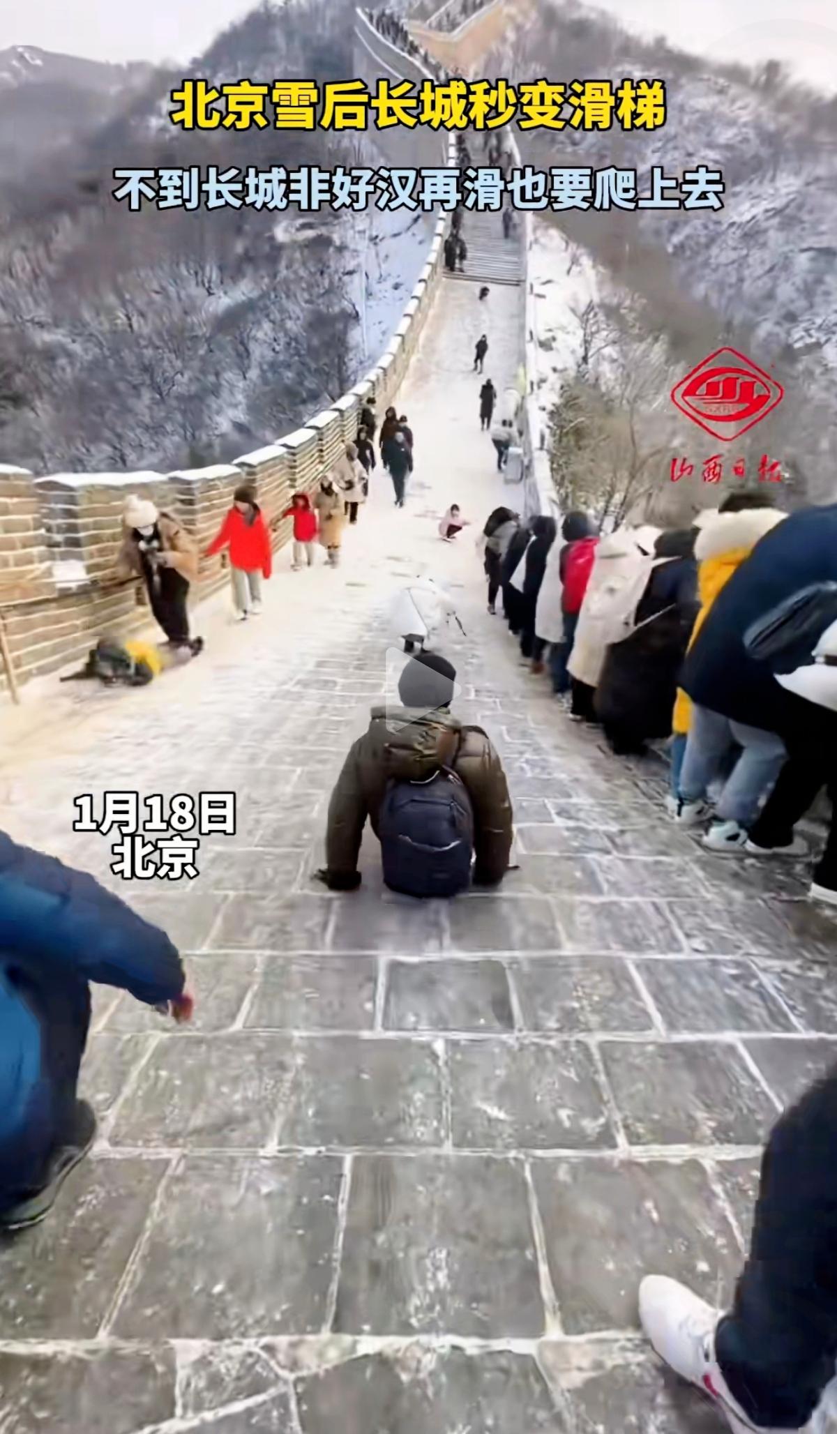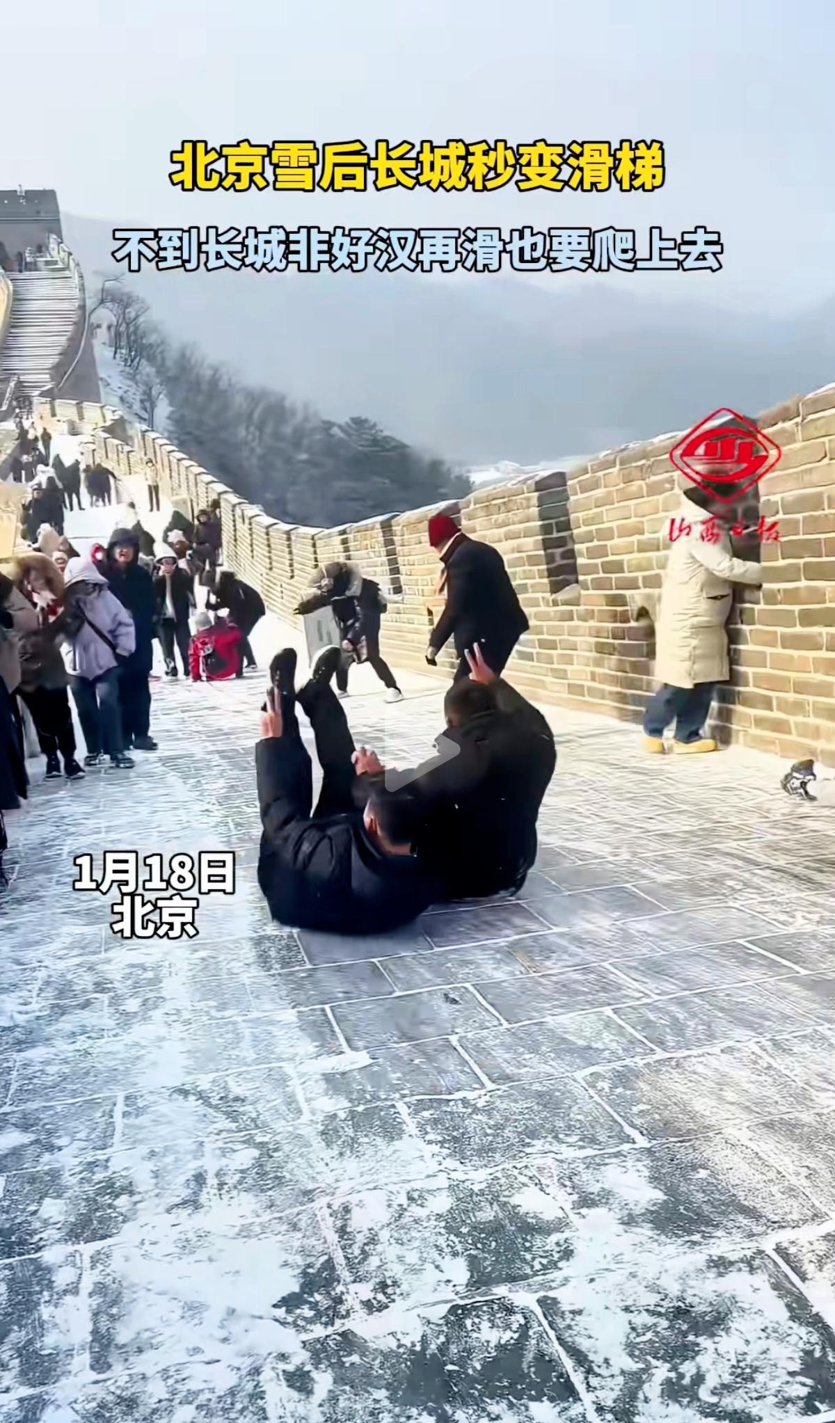 谁能想到北京长城一下雪,直接变身天然滑滑梯!这波冬日限定体验看着超爽,但我觉得玩得开心的前提,是把安全和敬畏放第一位,这才是雪游长城的正确打开方式。雪后的长城银装素裹美到出圈,台阶积雪被踩实成冰面,陡坡路段走起来直打滑,才有了游客顺势滑行的趣味画面,可长城本是珍贵文物,也是山地险地,随意滑行不仅容易摔受伤,还可能磕碰城墙。雪天滑长城 长城脚下大雪 冬天长城