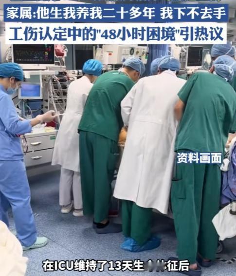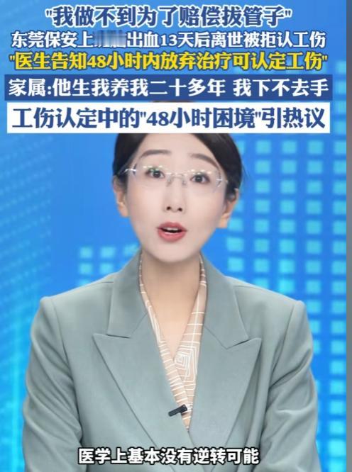“我做不到,为了赔偿拔管子!”! 东莞,保安父亲上班脑出血,医生告知儿子48小时内放弃治疗,可认定工伤!儿子:“他生我养我二十多年 我下不去手……”13天后,父亲还是抢救无效死亡,申请工伤认定被拒,网友炸锅!   “我们难道要掐着表,看着时间,在47小时59分的时候去决定拔不拔管子吗?”法庭上,蒋海说起父亲,声音哽咽。他的父亲蒋本武,一个普通的保安,倒在了2024年11月1日的深夜岗亭里。   事发那天,54岁的蒋本武像往常一样执勤。他是一个最普通的劳动者,这份工作是他养家糊口的依靠。谁也没想到,一场突发的脑出血,让他倒在了这个平凡的岗位上。   被紧急送医后,诊断结果令人心沉:高血压性脑出血,病情危殆,全靠呼吸机维持。这个家庭的顶梁柱,瞬间命悬一线。   第二天,医生将他的儿子蒋海叫到一旁。谈话内容直接而残酷:病人已基本处于“脑死亡”状态,救治希望极其渺茫。   而且医生出于告知义务,提到了一个关键的法律条款——如果家属在发病48小时内放弃治疗,可以据此申请认定工伤。这番话,本意或许是提供一种可能性,却无意中在亲人的伤口上,划下了一道更深的选择题。   一边是父亲尚存于机器之上的微弱生命体征,一边是可能关系到未来生活的工伤赔偿。情感与利益,在这个时刻被赤裸裸地摆上了天平。   蒋海懵了,巨大的压力让他几乎窒息。“他生我养我二十多年,我下不去手……”他这是最本能的反应,是身为人子无法跨越的伦理门槛。   家人们都哭作一团,没有任何犹豫,他们选择了继续维持治疗,哪怕多留父亲一分钟。   然而经过十余天的的抢救,眼看就不行了,家人带着最后一丝希望和不舍,决定让父亲叶落归根。他们花费重金租用救护车,长途跋涉十几个小时,将蒋本武送回湖北老家。   2024年11月14日,在老家的房子里,呼吸机最终还是被小心地撤除,蒋本武在亲人的围绕中离开了。从倒在岗亭到最终离世,整整过去了十三天。 然而,真正的冲突在父亲身后才汹涌而至。他生前所在的保安公司履行了责任,在11月6日就为其提交了工伤认定申请。   但东莞人社局的一纸《不予认定工伤决定书》,给了这个家庭第二次重击。   理由冰冷而明确:死亡时间超过“48小时”法定时限。公司的证明、家属的悲愤,在法律条文精准的时间刻度前,似乎都变得无力。   蒋海不服,他无法接受,自己对父亲的不舍与尽孝,竟成了无法获得工伤认定的“理由”。他将东莞人社局告上法庭。   2025年10月9日,法庭之上,双方针锋相对。家属方痛陈,法律不应逼迫公民在亲情与赔偿间做违背人伦的抉择;人社局则坚持,依法行政必须依据载明死亡时间的法定证明。   时间,这个最客观的刻度,在此刻显露出它最严酷的一面。   法律的制定,本意是为保障,为厘清边界,但当它精确到小时、分钟,与人的呼吸、心跳、伦理抉择相遇时,那份刚性便显得格外冰冷。   蒋海一家在父亲最后时刻的选择,源于人性中最朴素的不忍,这份不忍,如今却让他们站在了法律条款的对立面。   案子还在那里,它不仅仅关乎一个家庭的赔偿,更触及了一个根本的诘问:当法律遇见人性最柔软的深处时,其衡量的尺度,是否还能有细微的调整?   一个普通劳动者倒在了岗位上,他身后家庭的保障,是否应该被一个纯粹的时间数字完全定义?这些问号沉甸甸的,悬在法庭之上,也悬在每一个关注此事的普通人心头。   信息来源:海报新闻 文|灰度场 编辑|南风意史