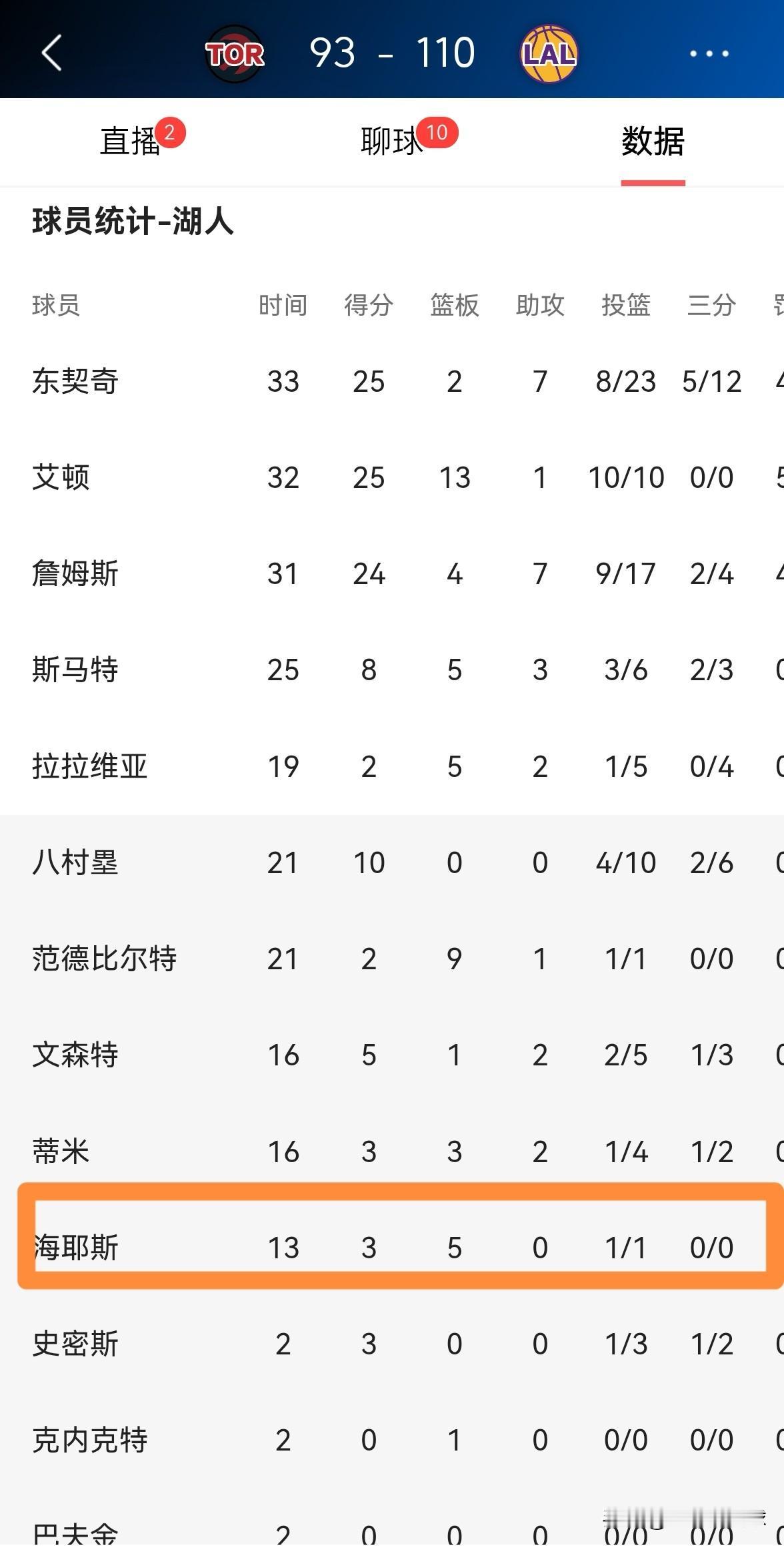 湖人中锋海斯的进攻欲望真是太弱了!在今天湖人主场以110:93战胜猛龙的比赛中,海斯在进攻端显得欲望不足,他在替补出战的13分钟里,仅仅出手了1次,投篮1中1,其中罚球2中1得到3分5篮板,还有2次失误,他的场上正负值为-2。 毫不客气的说,如果海斯在接下来的比赛中延续这样的进攻表现,那么他很难签下一份大合同,试问没有进攻欲望的球员怎么可能拿到高薪?