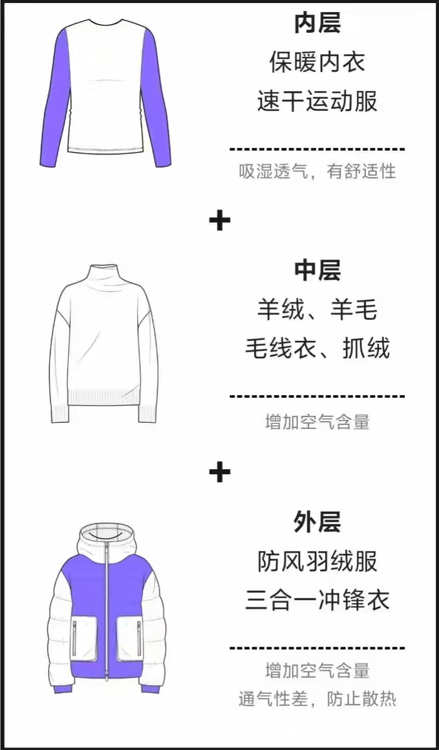 羽绒服里少穿才会更暖和吗 关于羽绒服的穿着方式,少穿一些内层衣物确实可以在一定程度上提高保暖效果。这是因为羽绒服的保暖原理主要依赖于其内部的空气层,而过多的衣物会挤压这些空气层,导致保温效果下降。 为什么少穿衣物会更暖? 空气层的作用:羽绒服通过内部的空气层形成隔热层,阻挡身体热量散失。 衣物的影响:太多衣物会压缩空气层,减少隔热效果,反而让身体散热更快。 推荐的穿衣技巧——“三明治”法: 第一层(贴身层):贴身的内衣,保持干爽。 第二层(中间层):轻薄保暖的衣物,如羊毛衫或抓绒衣。 第三层(外层):羽绒服,形成空气隔层。 注意事项: 选择合适的内层衣物,避免过厚。 保持内衣干燥,避免湿气带走体温。 根据天气变化调整穿着,适当增加或减少内层衣物。 总之,合理减少内层衣物,配合正确的穿着层次,能更有效地锁住体温,让你在寒冷天气中更暖和。羽绒服选购雷区 羽绒服冬季穿搭