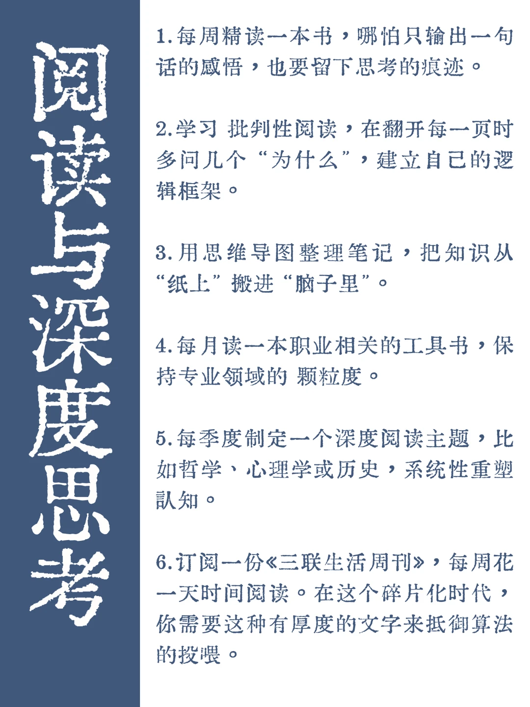 6⃣ 订阅一份《三联生活周刊》,每周花一天时间阅读。在这个碎片化时代,你需要这种有厚度的文字来抵御算法的投喂。📖