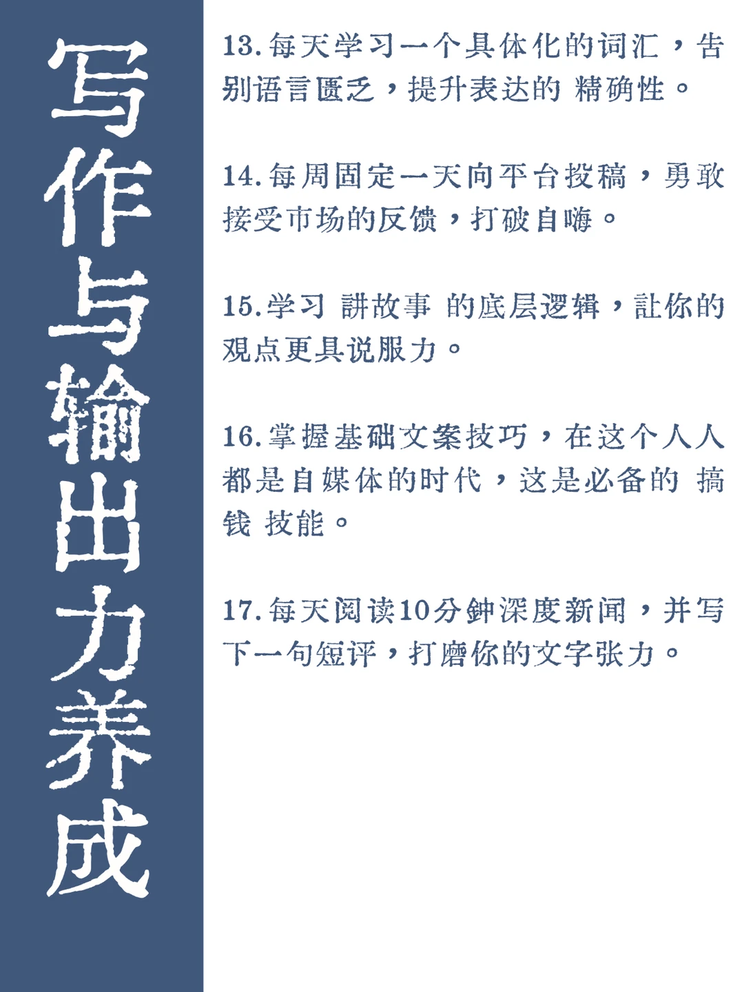 1⃣7⃣ 每天阅读10分钟深度新闻,并写下一句短评,打磨你的文字张力。
