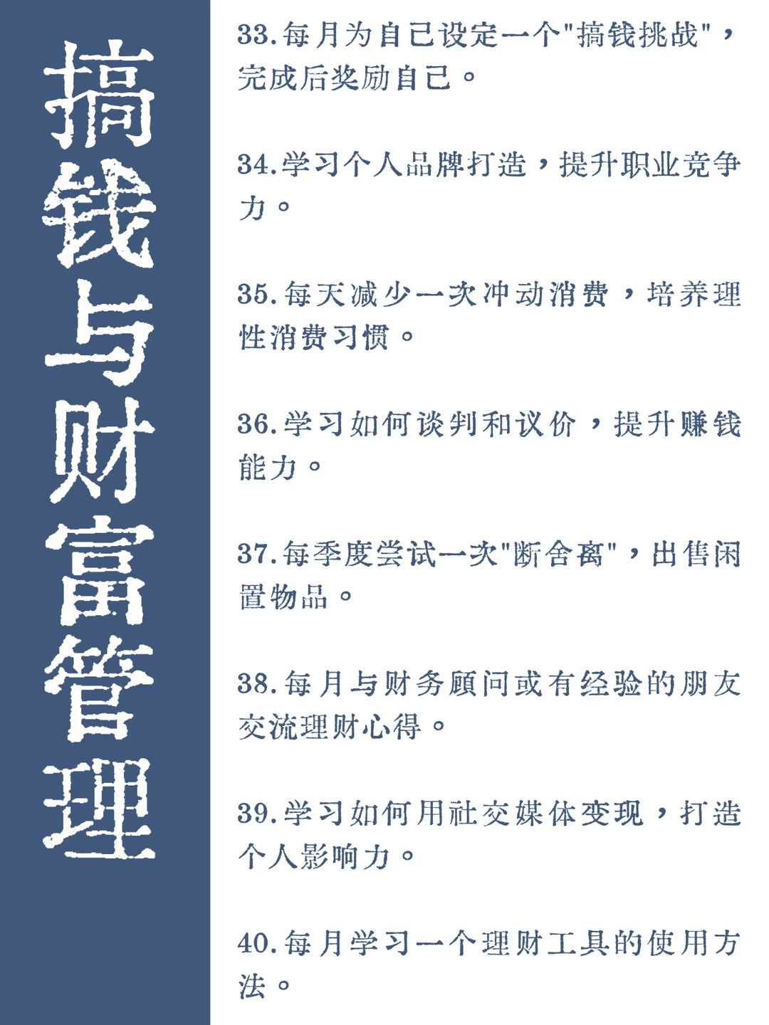 从阅读写作,财富管理,审美,能量管理4个版块4大维度展开。一份成长清单,帮助你成为更好的自己。