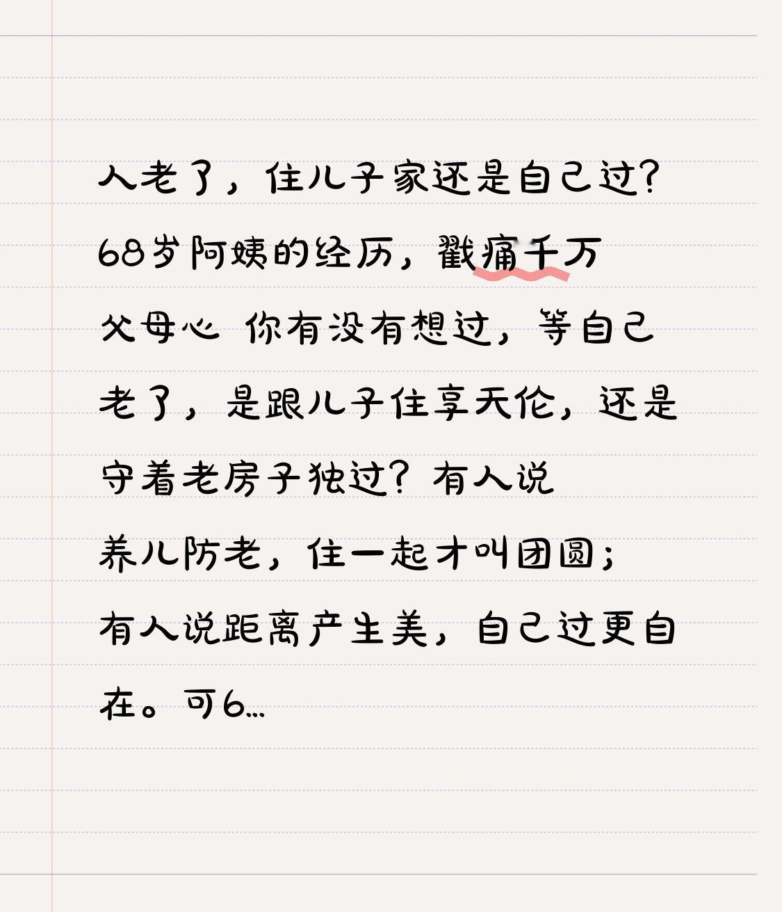 人老了,住儿子家还是自己过?68岁阿姨的经历,戳痛千万父母心 你有没有想过,等自己老了,是跟儿子住享天伦,还是守着老房子独过?有人说养儿防老,住一起才叫团圆;有人说距离产生美,自己过更自在。可68岁的张阿姨用亲身经历告诉你,这道选择题,远比想象中更残酷。 张阿姨早年丧夫,一把屎一把尿把儿子拉扯大,供他上大学、在城里买房。儿子结婚时,她毫不犹豫把老家的房子卖了,揣着全部积蓄凑了首付,满心欢喜等着跟儿子享福。刚住进去的前三个月,确实是蜜里调油:儿媳每天变着花样做饭,儿子下班就陪着聊天,张阿姨每天买菜、打扫,忙得心甘情愿。 可转折点,从她摔了一跤开始。那天买菜回来下楼梯,张阿姨没站稳崴了脚,卧床休养了半个月。刚开始儿子儿媳还端茶送水,可时间一长,抱怨就来了:“妈,你这一躺,家里卫生都顾不上了”“每天请假扣工资,请护工又太贵”。更让她寒心的是,她听见儿媳跟儿子吵架:“当初就不该让她来住,现在成累赘了!” 伤好后,张阿姨主动提出搬出去。儿子愧疚,想给她租个近点的房子,可张阿姨却回了县城,用仅剩的一点养老金租了个小单间。她说:“住儿子家,看脸色、受委屈,不如自己过清净。”现在的她,每天去公园遛弯、跟老姐妹聊天,自己做饭自己收拾,虽然孤单点,但心里踏实。 其实很多老人都面临这样的困境:住儿子家,怕给孩子添麻烦,怕婆媳矛盾;自己过,又怕生病没人管,夜里孤单。可张阿姨的经历告诉我们:养老,拼的从来不是孩子孝不孝顺,而是自己有没有底气。哪怕手里只有一点积蓄,有个能遮风挡雨的小窝,日子也能过得有尊严。 人都会老,我们今天讨论的,也是明天自己要面对的。你觉得人老了该住儿子家,还是自己过?欢迎在评论区说说你的看法,点赞转发,让更多人关注老年人的养老困境,也给身边的父母多一份理解和关爱。