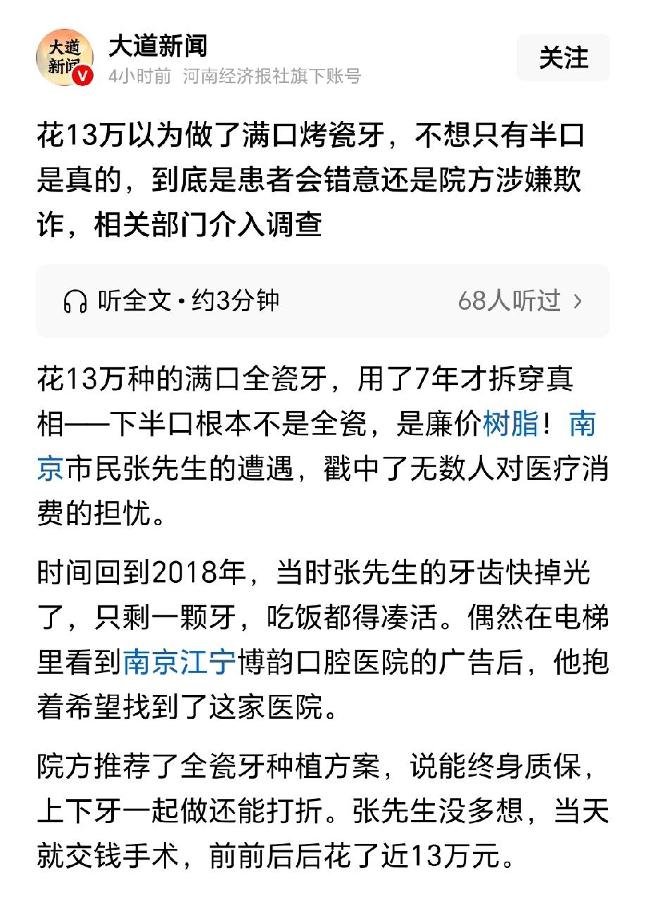江苏南京,男子掉的只剩一颗牙,吃饭都成了问题。正在焦虑牙齿时,他偶然在电梯间看到口腔医院的广告,在医生推荐下,男子花费13万做了满口烤瓷牙。本以为可以一劳永逸,可谁知,7年后,男子的烤瓷牙竟然磨损严重,牙缝里总是卡食物残渣,经过检查才得知,他只有半口烤瓷牙,剩下一半全是廉价树脂。男子找口腔医院讨要说法,医院的解释让男子瞬间傻眼! 据大道新闻报道,2018年,张先生为牙齿的事儿愁得睡不着觉。 四十多岁的人,嘴里就剩最后一颗牙,吃饭全靠“抿”,稍微硬点的东西都不敢碰,连顿踏实饭都吃不上。 这天他坐电梯上楼,瞥见墙上贴的口腔医院广告,说能做全瓷牙种植,终身质保,还能打折。 这个消息像救命稻草,张先生当天就揣着钱找了过去。 医院的医生热情接待了他,推荐了全瓷牙种植方案,拍着胸脯说上下牙一起做,不仅效果好,还能享受优惠,而且是终身质保,往后再也不用为牙齿发愁。 张先生一听这话,心里的石头落了地,没多问细节,当天就签了字、交了钱,前前后后花了快13万。 手术挺顺利,术后没多久就能正常吃饭,头几年用着也确实舒心,张先生逢人就夸这钱花得值,总算能好好享受美食了。 可从去年开始,麻烦事儿找上门了。 张先生每次吃完饭,牙缝里总爱卡食物残渣,用牙签剔、用牙线抠,怎么都清理不干净,时间长了还透着股异味,让他特别闹心。 一开始他以为是用得久了正常磨损,没太当回事,想着今年7月去当初那家口腔医院洗个牙,顺便让医生检查下。 没想到,他一进门说要洗牙检查,就被工作人员找各种理由拒绝了,这让他心里犯了嘀咕:好好的怎么不让检查? 带着疑问,张先生只能换了家牙科医院就诊。 医生拍了X光片,拿着片子看了半天,直言不讳地告诉他:你这下半口的种植牙根本不是全瓷牙,是廉价树脂的。 张先生当时就懵了,以为自己听错了,赶紧追问:我花13万做的满口全瓷牙,怎么会是树脂的? 为了确认真相,他又跑了另外三家口腔机构,结果每家的说法都一样,X光片里下半口牙几乎不显影,这正是树脂材质的特征。 拿着四家医院的检查结果,张先生又气又急,翻出2018年的门诊收费清单,只见上面明明白白写着无牙颌种植4-6颗种植体,费用87000元,国产氧化锆全瓷冠,费用25000元,里面没有提过半句树脂的话。 他当即找到当初那家口腔医院讨要说法,医院的王院长出面回应,一番话让他彻底傻眼了。 王院长表示,当年张先生下颌牙问题更严重,院方给制定的是无牙颌种植方案,87000元就是这个项目的费用,种植当天装的是能直接吃饭的临时牙冠。 至于下颌牙冠材质,王院长承认,当时医生确实没在诊疗记录里写清楚,张先生下半口装的是烤塑牙,本质就是硬质树脂牙,是树脂和塑料的混合材质。 这种材质价格低、重量轻,但不耐用,容易磨损、变色,和全瓷牙的价格差了好几倍甚至十几倍。 王院长还解释,2018年全瓷牙价格很高,要是下半口也用全瓷牙,牙齿的费用至少得15万,而不是当时的87000元。 而且按当年的工艺和诊疗习惯,医生一般不会做满口全瓷牙,怕像两个瓷碗相撞一样出问题,通常都是半口全瓷、半口树脂,现在工艺进步了才能做满口全瓷。 他承认这是当年医生的失误,提出为张先生免费更换一套全瓷牙。 可张先生根本不接受这个方案。他说自己花13万就是冲着满口全瓷牙来的,院方当初承诺的是终身质保的全瓷牙,收费也按全瓷收。 结果,才用了7年就发现货不对板,这七年里因为树脂牙磨损、卡食物残渣遭的罪,全是院方欺诈造成的。 目前,张先生已经把情况反映给了当地卫生监督和市场监督部门,到底是张先生会错意还是院方涉嫌欺诈,我们静待相关部门的调查结果。 《消费者权益保护法》第五十五条规定:经营者提供商品或者服务有欺诈行为的,应当按照消费者的要求增加赔偿其受到的损失,增加赔偿的金额为消费者购买商品的价款或者接受服务的费用的三倍;增加赔偿的金额不足五百元的,为五百元。 医院宣传“满口全瓷牙”、收费清单标注“全瓷冠”,却隐瞒下颌用廉价树脂的事实,未获得张先生同意,属于故意欺诈。 张先生可凭广告、收费清单、第三方检查报告等证据,要求医院退还13万诊疗费,并支付3倍,即39万的惩罚性赔偿,额外损失也可一并主张。 《民法典》第五百七十七条规定:当事人一方不履行合同义务或者履行合同义务不符合约定的,应当承担继续履行、采取补救措施或者赔偿损失等违约责任。 张先生与医院的医疗服务合同明确约定“满口全瓷牙”,医院交付“半口树脂”的行为构成违约。 医院提出的“免费更换全瓷牙”是补救措施,但张先生可拒绝,要求其同时赔偿7年里因树脂牙产生的清洁费、治疗费等损失。 此外,张先生也可选择让医院按约定完成全套全瓷牙更换,并赔偿相关损失。