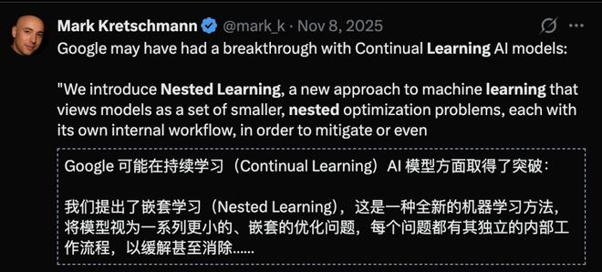 特别是嵌套学习,让外界认为谷歌在持续学习上已取得突破。