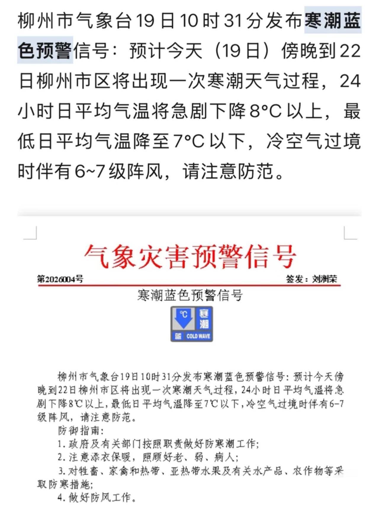 柳州即将开启“速冻”模式‼️ 从19日晚开始,柳州的气温将大幅跳水,最低气温高寒山区可达-6℃。不仅如此,北部高寒山区还会有雪哦,冻雨、道路结冰也会随之而来,大部地区还有6~7级偏北大风。这天气可太冻人了,秋裤赶紧安排上。