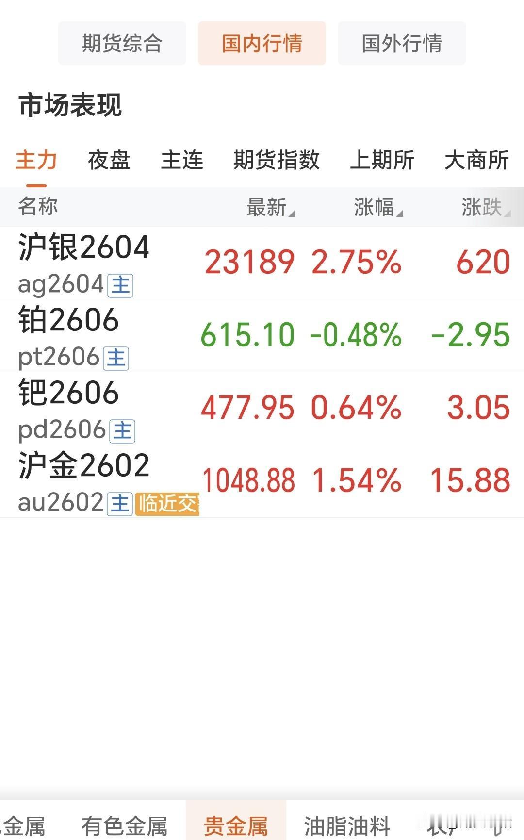 1月19日, 国内贵金属强势运行, 黄金和白银大幅飙升, 黄金更是创出历史新高。 黄金期货主力合约 收盘于1048.88元, 涨幅1.54%; 白银期货主力合约, 收盘于23189元, 上涨2.75%。 钯金主力上涨0.64%, 但是铂金主力下跌0.48%。 继续关注上方压力情况!