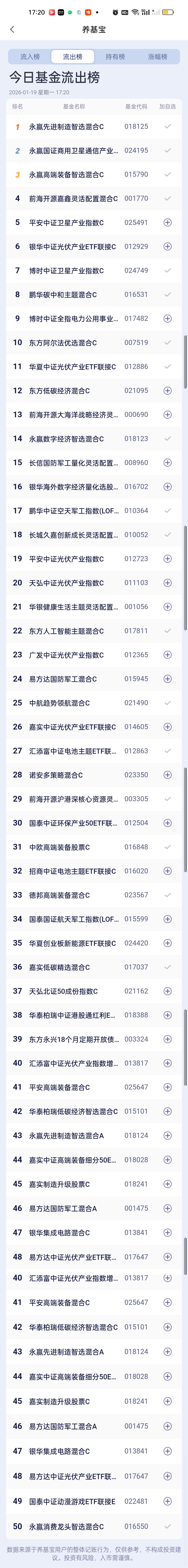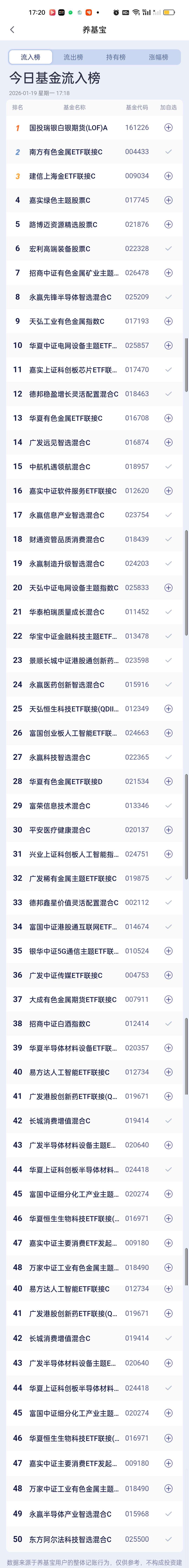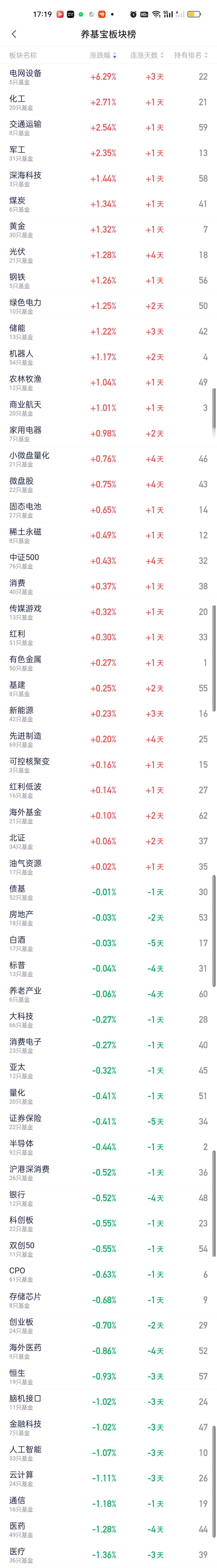 今日基金加仓榜,减仓榜,板块榜以及估值榜已全部更新完毕。加仓榜前三名是国投瑞银白银期货,南方有色金属ETF联接,建信上海金ETF联接。 减仓榜前三是永赢先进制造,永赢国证商用卫星,永赢高端装备智选。 板块榜涨幅居前的是电网设备,化工,交通运输,军工,深海科技,煤炭,黄金,光伏,钢铁,绿色电力,储能,机器人,农林牧渔,商业航天,跌幅榜居前的是创新药,AI应用,恒科,医疗,医药,通信,云计算,人工智能,金融科技,脑机接口。