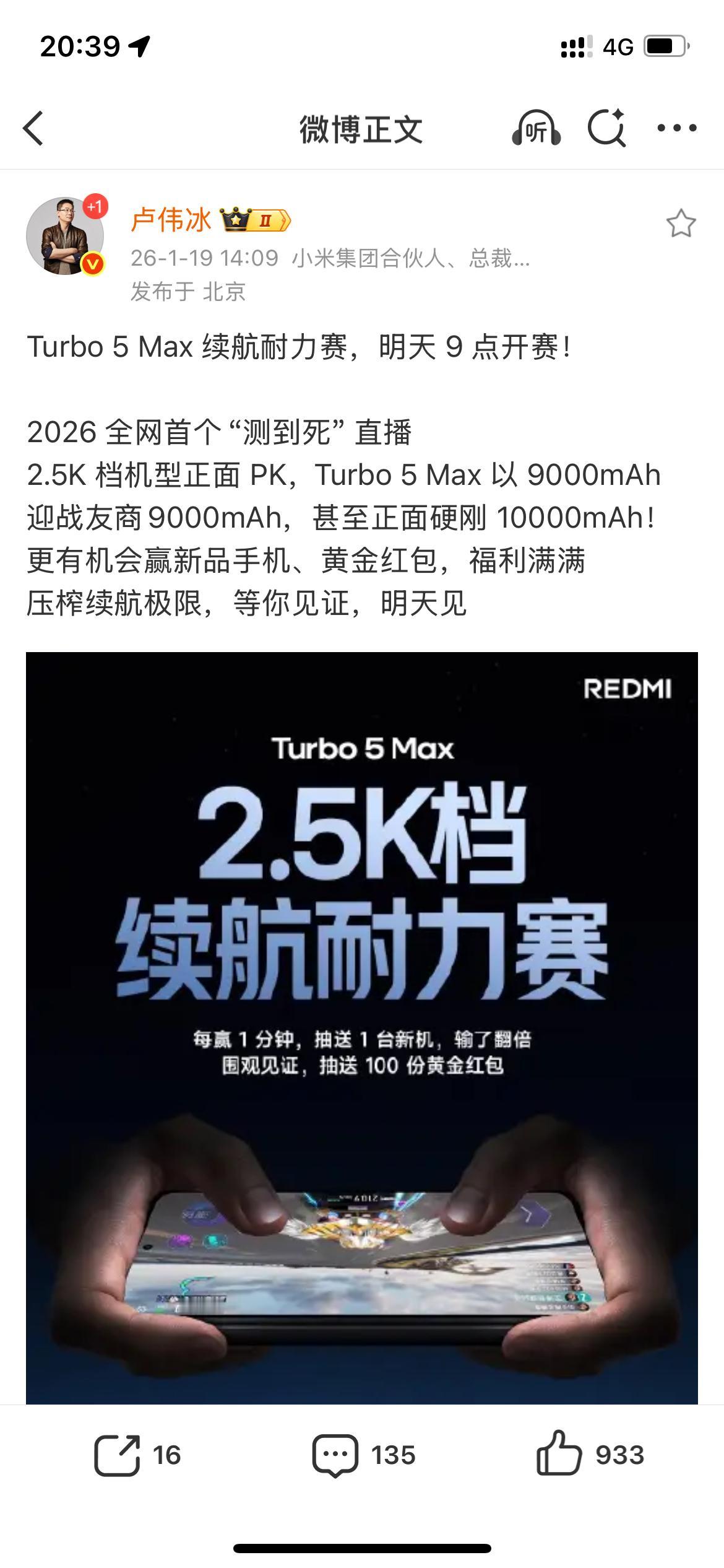 友情提示,明天想要观看卢总直播REDMI turbo 5 Max的朋友,提前把手机插上电,直播时长可能会超过12小时[吐舌]