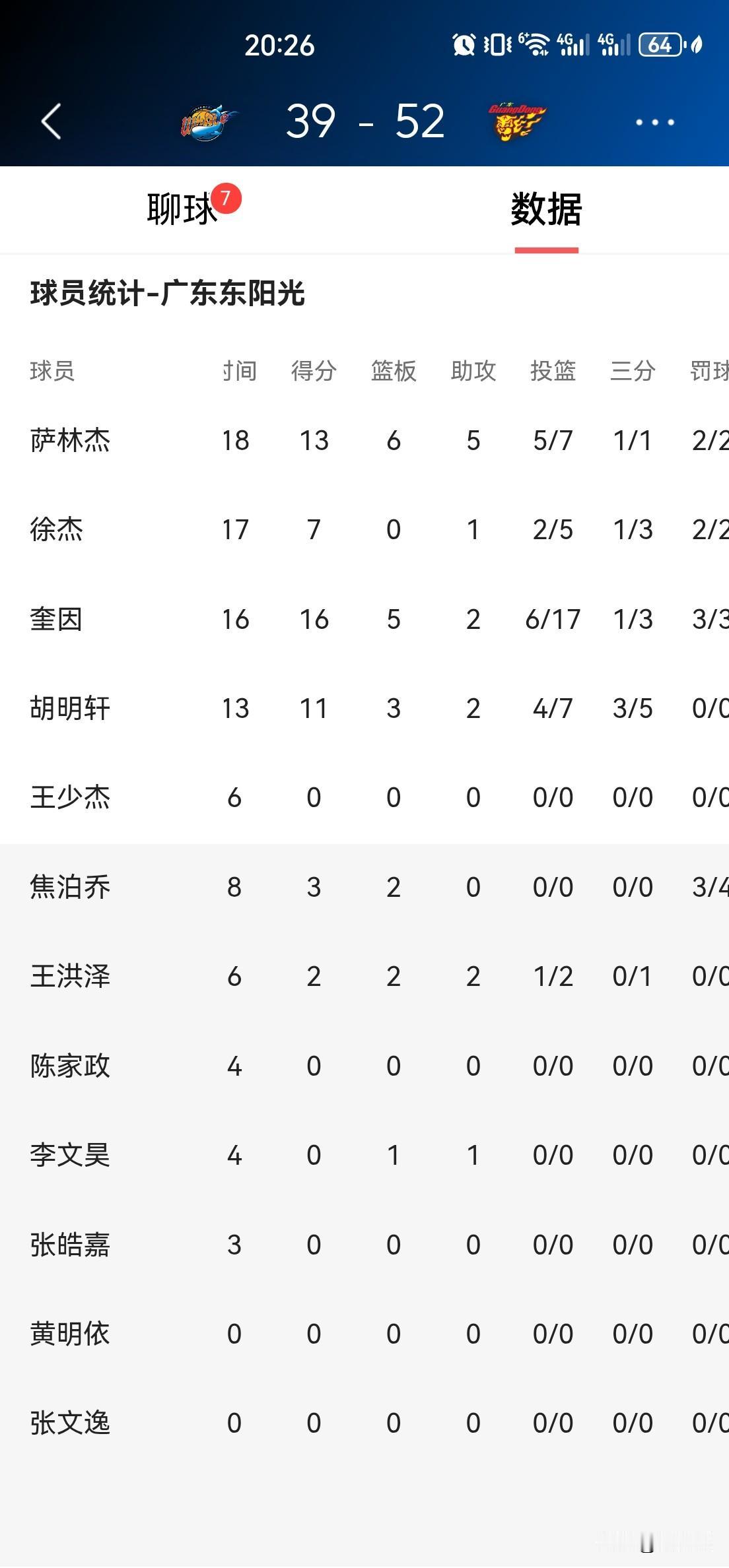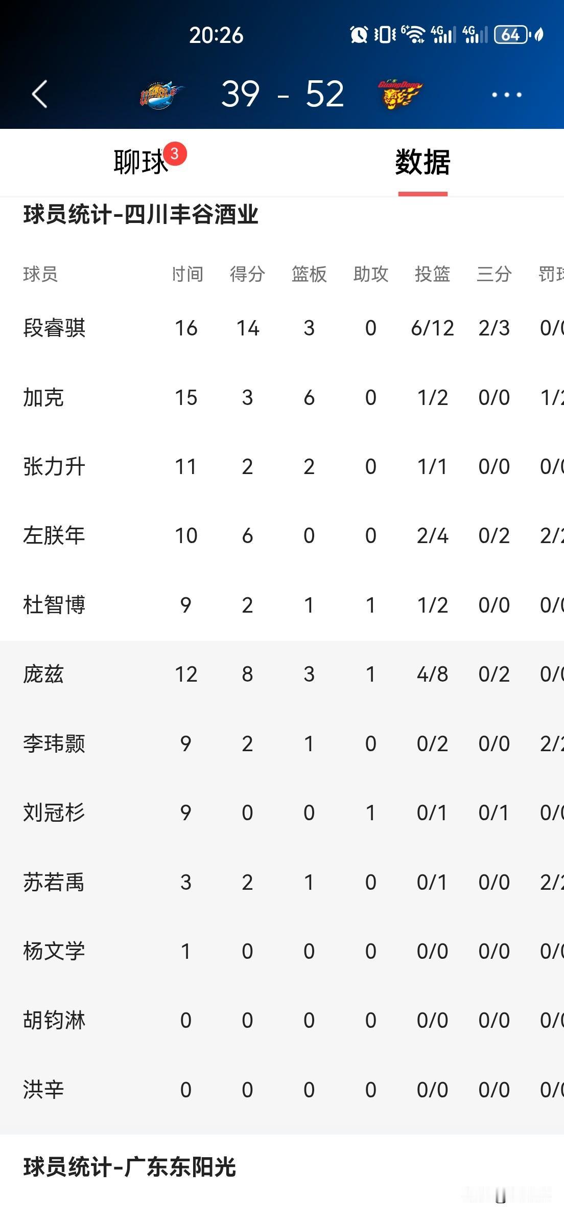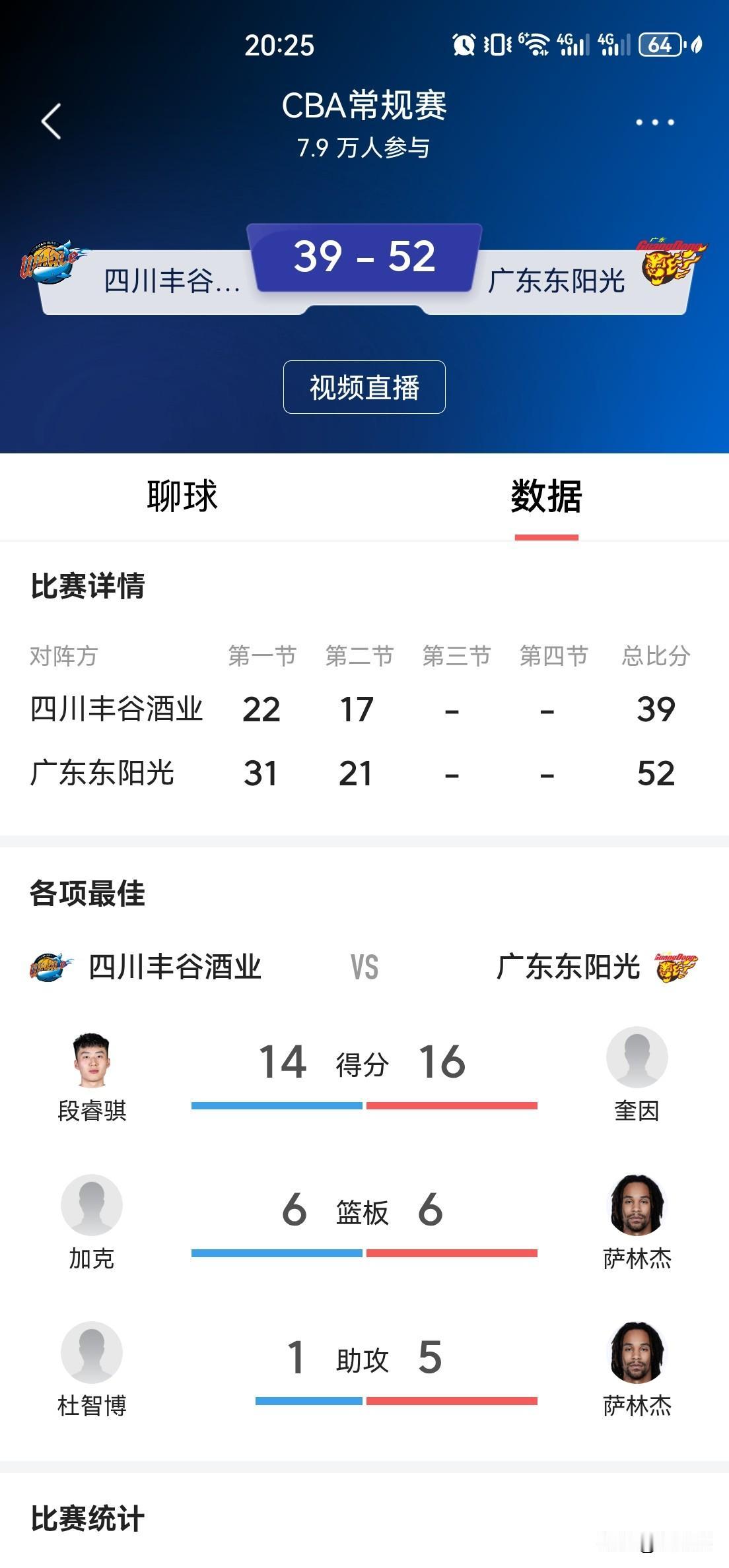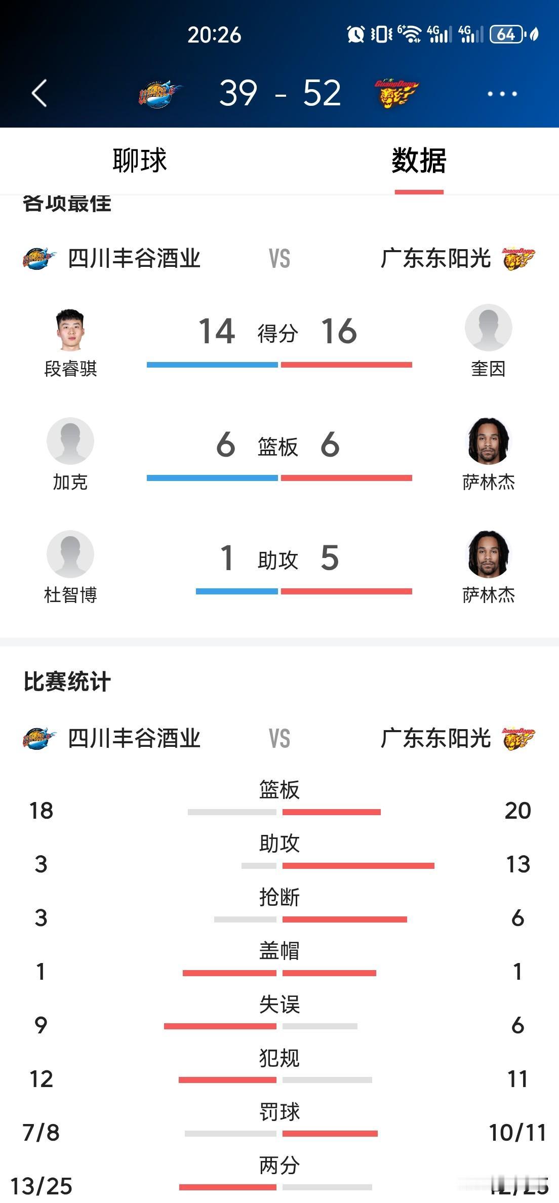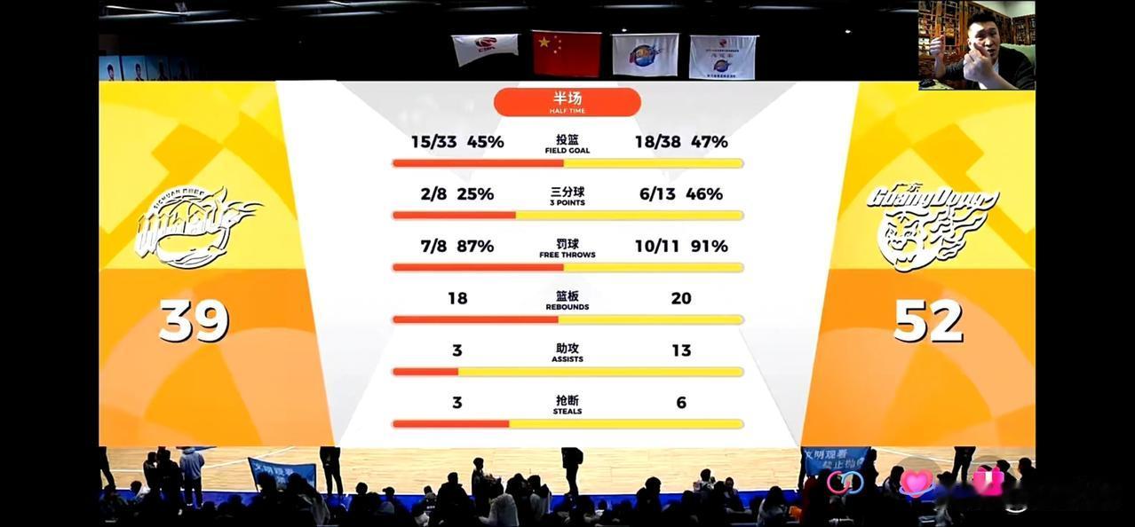 胡明轩状态回归! 广东半场52:39领先四川13分。胡明轩7投4中,其中三分球5投3中,拿到11分3篮板2助攻;奎因17投6中,拿到16分5篮板2助攻;萨林杰7投5中,拿到13分6篮板5助攻;徐杰5投2中得到7分。 四川队段睿琪12投6中得到14分3篮板。四川队第二节前半段打出流畅阵功和强悍,追到仅落后两分。但是,后半节全队突然断电,被广东队打出一波11:0,瞬间拉开比分。