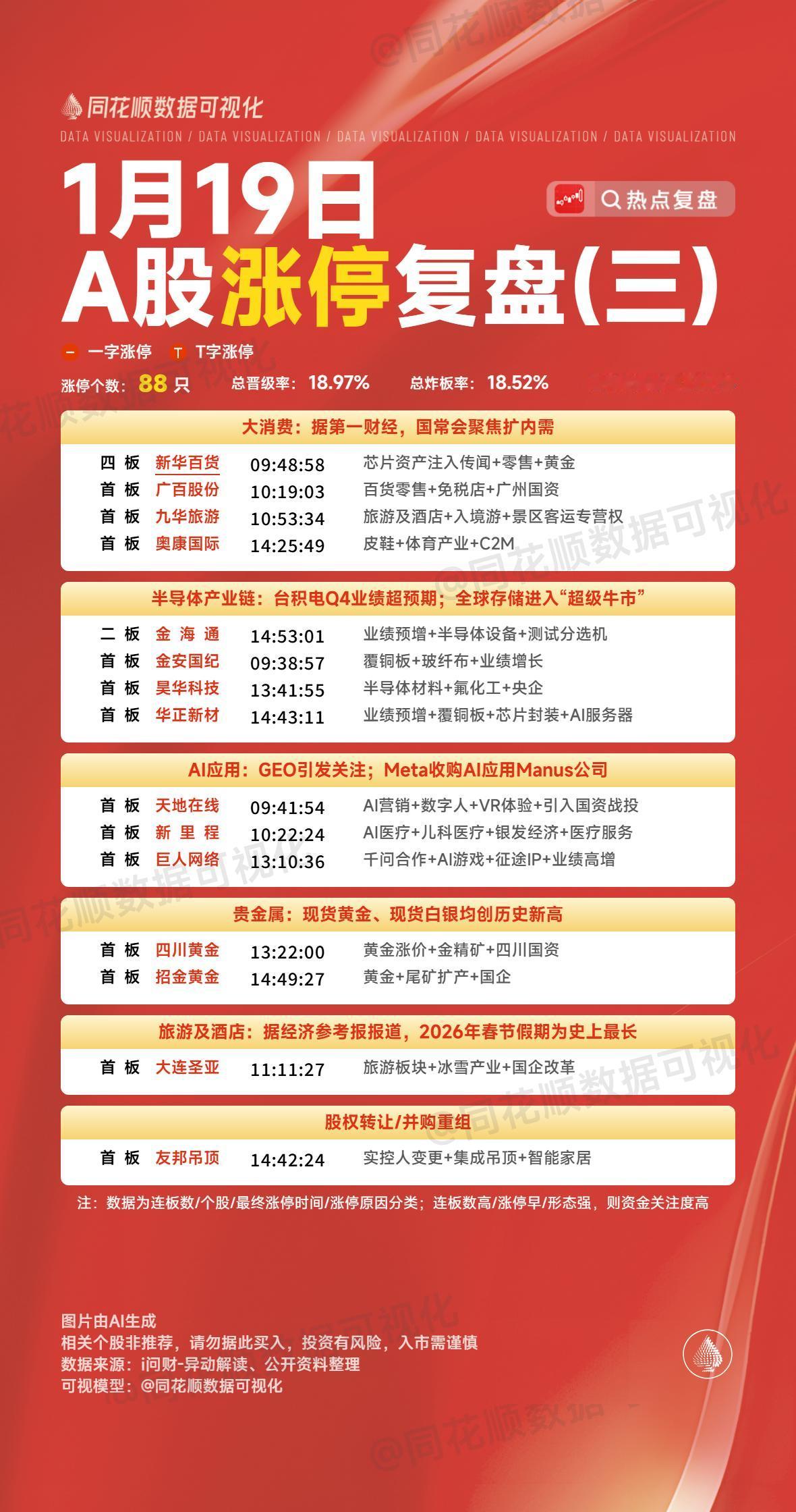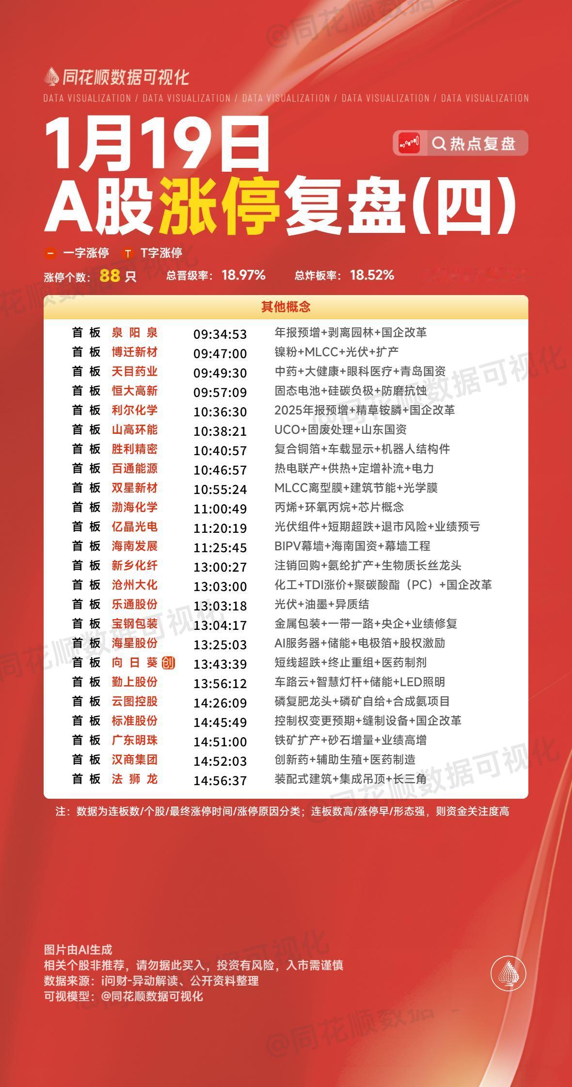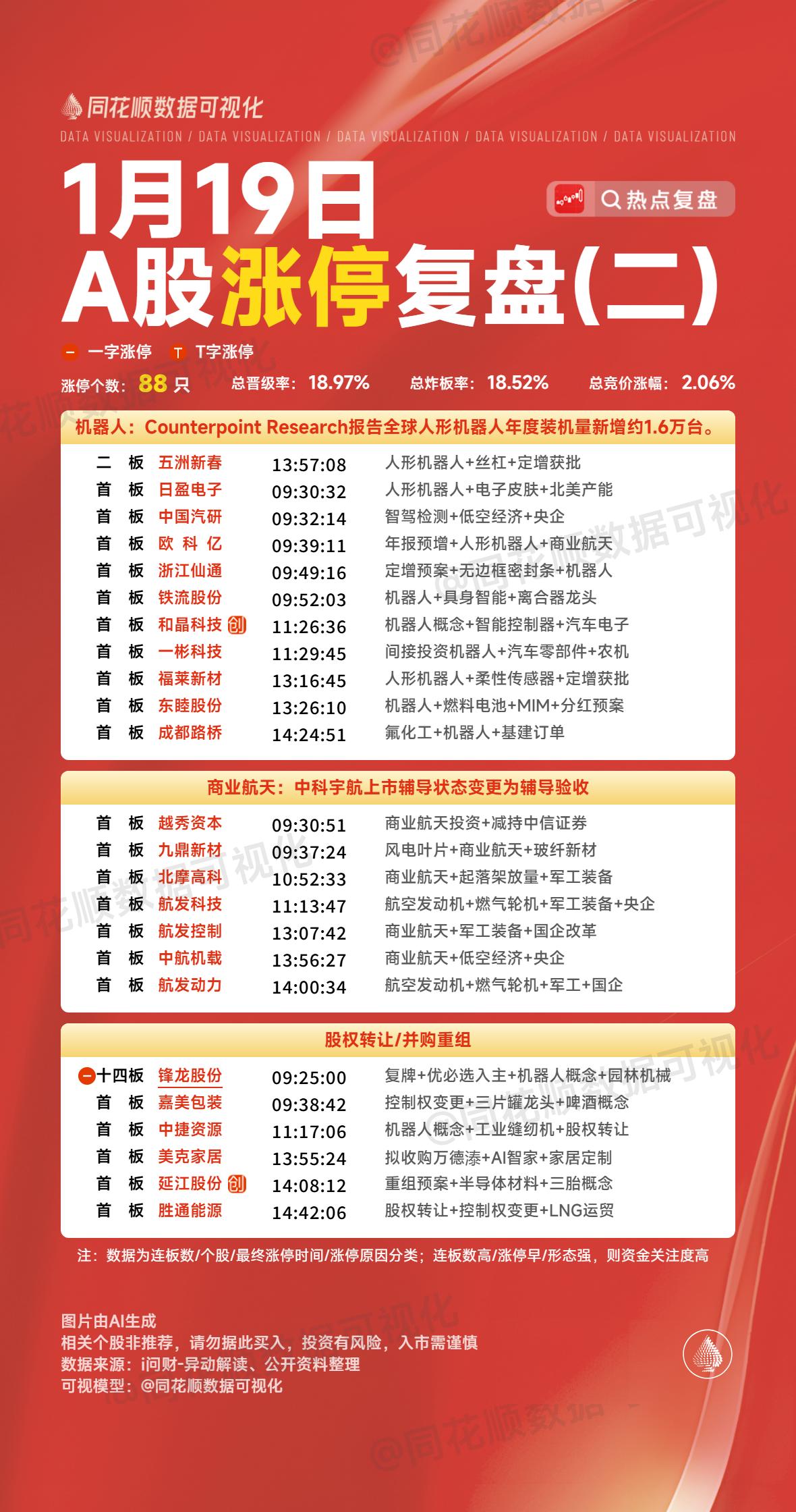 1月19日复盘:汉缆股份、中国西电、五洲新春、康强电子、海格通信隔日走势的一些看法! 1、汉缆股份(电网设备) 汉缆在9点20分之前的封单并不大,但是随着康强封单的大幅缩减,市场更看好的明显是电网设备的修复,所以在20分之后是有明显逐渐加单的,再加上开盘后电网设备方向出现了强共振上涨,汉缆只在开盘成交了部分资金,之后几乎完全没有抛压,走出了一个非常强势的晋级形态! 盘后的龙虎榜是3日榜,买一是量化西大街,中信吴宁西路占据了买二,其余买盘还有两个小游资,卖盘整体抛压非常小,汉缆这个榜单就是明显的强势做多表现,而且今天整个电网设备走出了商业航天的感觉,隔日就算有分歧,多只二板个股大概率会有晋级的,而汉缆毫无疑问是最前排那一个,从情绪上看,隔日就是更强的大单一字了,而如果它开出大单一字,就算电网设备出现明显分歧,但是去弱留强后的趋势性就非常值得关注了! 2、中国西电(电网设备) 早盘电网设备方向修复非常明显,周五高开兑现的西电开盘出现了明显的抢筹拉升,而它也是电网设备前期强势个股中第一个有冲板动能的,在板上出现情绪反复后,有资金承接彻底封死涨停,但是午后还是出现了明显的炸板放量,好在很快有资金承接回封,走出了一个比较强势的止跌首板形态! 盘后的龙虎榜买盘是两个量化加上曲江池、中山东路,还有就是沪股通的大幅买入,卖盘则多为东财席位,这是一个非常强势的榜单,再加上尾盘特变、保变、三变都出现了共振涨停,也就是周五导致整个电网设备情绪回调的前排个股全部反包,而西电毫无疑问就是这些个股中最强的,如果板块有持续性,它毫无疑问就是绝对的中军趋势核心,那么隔日冲高的溢价是有保证的,电网设备能不能走出类似商业航天的高潮值得期待,这个方向生不逢时,正好卡在短线情绪比较差这个节点,想要连续高潮会非常困难,所以西电想要走出类似卫星一样的连板是有难度的,但是如果汉缆足够强,西电的趋势表现还是非常值得期待的! 3、五洲新春(机器人) 机器人方向在上周五多数走出冲高回落,五洲也是一个烂板走势,早盘在电网设备特别强势的情况下,五洲更多的是高位横盘震荡,临近11点才有资金承接去上板,但是它毕竟是一个明显的突破形态,所以整体抛压还是很大的,几乎很快出现炸板回落,好在高位支撑明显的情况下在早盘收盘前有资金承接强封,但是最终还是没有封住,午后开盘顶住分歧后有资金承接封死涨停,但是依然没有放量,直到之后再次炸板后才彻底放量封死涨停,走出了一个高位突破的放量连板形态! 盘后的龙虎榜是3日榜,买卖盘被量化包圆,五洲的趋势是明显量化引导的,而且它在第一波断板后持续高位横盘超过10个交易日后再次启动的形态是非常好的,那么这一波还有明显向上的空间,所以隔日得溢价是能够保证的,而且今天机器人同样有比较强的板块效应,所以对于五洲来说,隔日只要短线情绪依然不错,它或许依然有冲板动能,但是对于这只个股来说,现在这个位置想走加速确实有点难度! 4、康强电子(存储芯片) 上周五存储芯片走出高潮表现,但是早盘竞价整个存储芯片的表现是明显不及预期的,所以康强上板后被资金大幅砸盘,虽然盘中有资金承接回封,但是最终还是断板收场! 盘后的龙虎榜92科比难得上榜,是明显的做T引导,买盘还有两个机构接盘,卖盘是明显的获利盘兑现离场,这样的榜单并不差,在板块情绪不好的情况下,量化和游资选择砸盘离场太正常不过了,就跟周五的电网设备一样,不过康强相比周五那几只被深砸的电网个股的承接要强的多,最终还是收出了一根阳线,说明资金整体承接情绪还可以,隔日一旦存储芯片出现明显修复,康强至少情绪就不会太差,继续走出冲高是大概率,如果存储芯片足够强,不排除它走出反包形态,毕竟这只个股整体的位置并不高! 5、海格通信(商业航天) 海格成了唯一连续3天一字地板的个股,而它也是这轮短线极端情绪的始作俑者! 盘后的龙虎榜是3日榜,陈小群、江苏路都接了一个多亿筹码,卖盘是通道优势抢跑的资金,可以看到陈小群并没有机会卖出,江苏路和消闲派同样大部分筹码被闷,今天在金风情绪翘板时,海格同样出现了1个多亿资金翘板,但是封单确实没有松动,尾盘再次出现1个多亿资金承接,这两笔资金大概率就是小群和江苏路的,再加上情绪到了这,隔日海格开门放人会是大概率的,特别是这个榜单出来后,也许竞价就会有资金去直接承接,所以隔日海格的表现还是比较有看点的,像今天金风一样出现拉升红盘的概率还是非常大的! 本文只限于分享和交流,不构成投资建议,股市有风险,投资需谨慎!