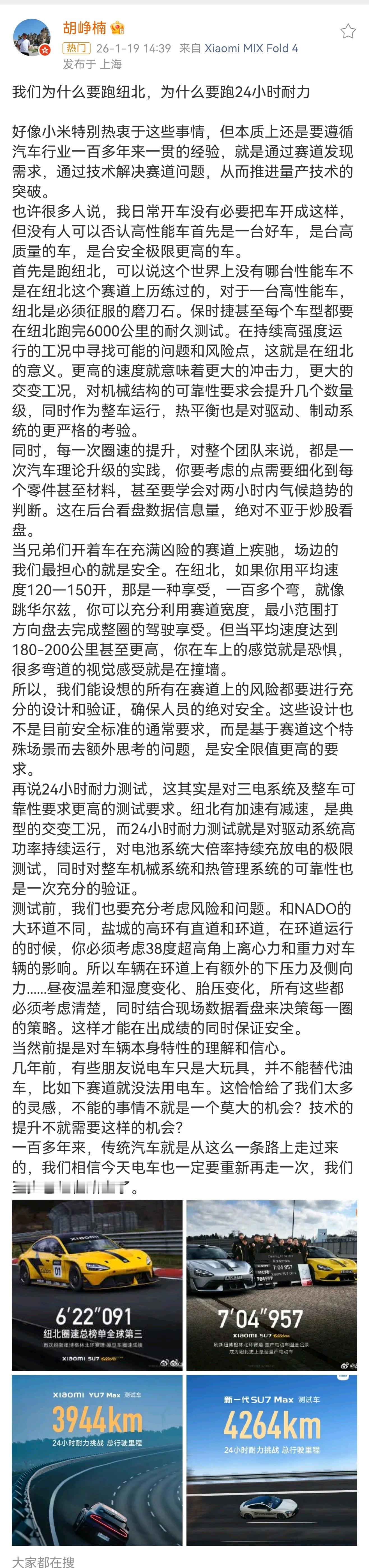 胡峥楠对小米汽车热衷纽北测试的回应,其实点出了做这件事情的本质:不是单纯刷圈炫速度,而是跟着汽车工业百年传统走——用极限环境逼出量产车的潜在问题,再把赛道上练出的技术落到日常驾驶里。胡峥楠谈小米为什么要跑纽北
