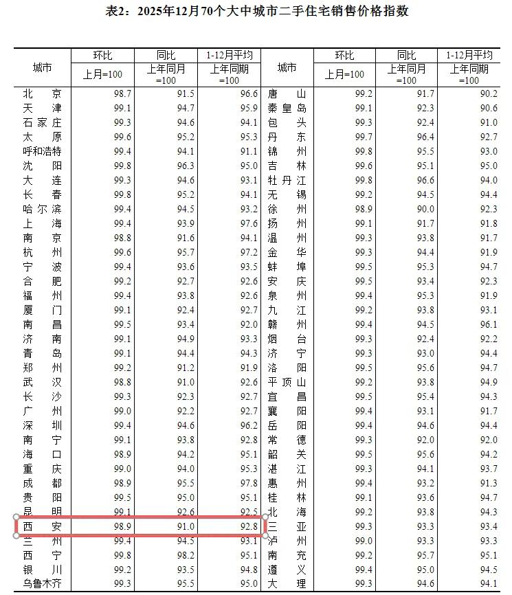 最新!西安新房、二手房价格双双下跌,新房价格连续第16个月下跌... 今日,国家统计局发布的《2025年12月份70个大中城市商品住宅销售价格变动情况》数据显示,西安楼市在去年12月依旧处于下行通道,新房与二手房价格双双下滑。 新房市场方面,12月西安新房价格环比下降0.5%,同比下降5.6%。值得注意的是,这已是西安新房价格连续第16个月出现环比下跌。持续的下跌态势,反映出当前新房市场面临着较大的去库存压力。购房者观望情绪浓厚,市场整体成交活跃度不高,开发商为促进销售,不得不采取降价等策略,进而导致房价持续走低。 二手房市场同样不容乐观。12月西安二手住宅价格环比下降1.1%,同比下降9%,且这是二手住宅价格连续第26个月下跌。长时间的下跌,使得二手房市场信心受挫。一方面,大量房源挂牌,供应过剩,而需求端却未能有效跟进;另一方面,购房者对房价预期降低,更加谨慎地入场,进一步加剧了市场的供大于求局面。 西安新房与二手房价格的连续下跌,是市场供需关系....购房者预期等多种因素共同作用的结果。尽管当前市场处于调整期,但也不乏积极信号,如部分区域房价逐渐趋于稳定,市场分化态势明显。 未来,随着政策的逐步优化和市场信心的恢复,西安楼市有望迎来新的转机,走出当前的低迷困境。