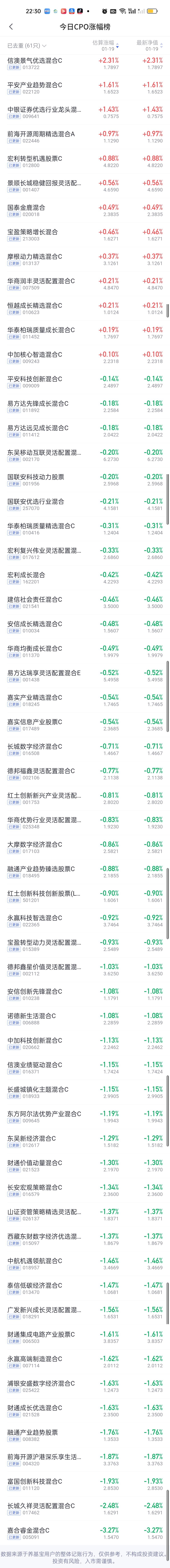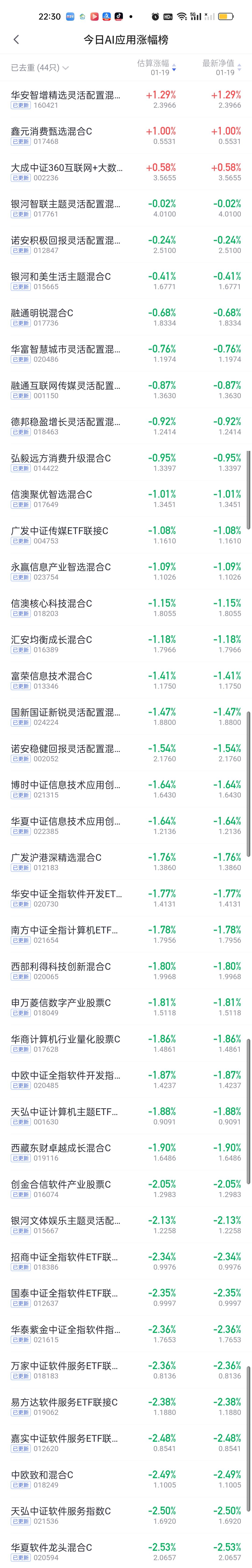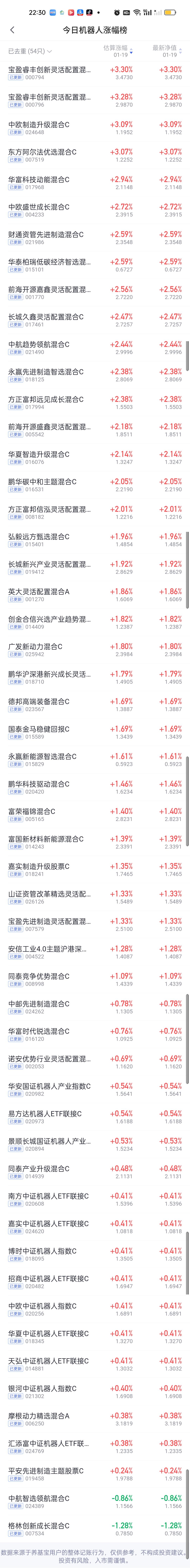 今日基金净值榜已全部更新完毕。华夏中证电网设备主题ETF联接5.46%排名第一,德邦新兴产业5.44%排名第二,东方阿尔法科技甄选5.15%排名第三,平安鑫安4.99%排名第四,汇添富新睿4.93%排名第五。 涨幅在4%以上的还有招商瑞丰4.82%,长城景气成长4.70%,国泰恒生电网ETF联接4.67%,天弘中证电网设备主题指数4.57%,富国碳中和4.32%,宏利高端装备股票4.17%,此外中欧高端装备股票3.98%,宝盈成长精选3.95%,表现也不错。 跌幅方面,平安港股通医疗创新3.52%排名第一,汇丰晋信医疗先锋3.36%排名第二,平安核心优势3.32%排名第三,嘉合睿金3.27%排名第四,永赢港股通科技智选和平安医药精选股票3.21%并列第五。 商业航天,AI应用,半导体,CPO,机器人,创新药涨幅榜一并奉上!