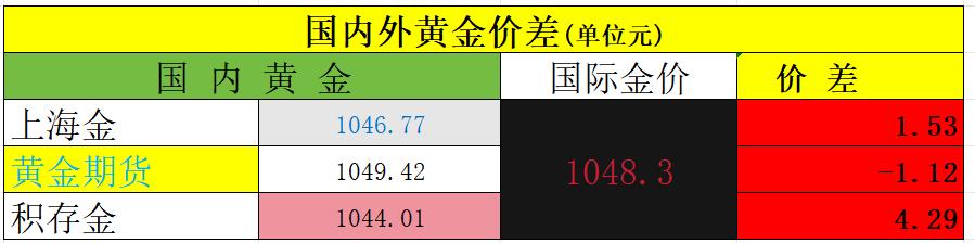 上海金周一收盘于1046.77元; 国内黄金期货主力 现价1049.42元; 民生积存金报价1044.01元。 国际金价现价4671.1美元, 简单折算成人民币就是1048.3元。 我们知道国内外黄金 是有一定价差的。 通过下图的数据,可以看出: 黄金期货最强, 国际金价次之。