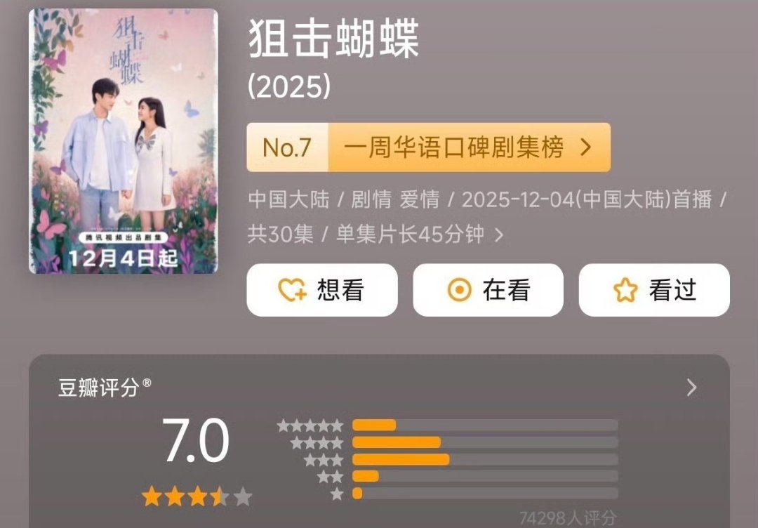 狙击蝴蝶热播期结束,集均1612万 平分7.0成绩算不错的 恭喜啦!