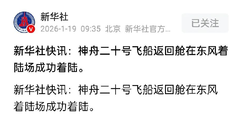 神舟二十号飞船回来了!   这则消息从东方传来,根据新华网报道,1月19日早晨9时34分,这艘备受关注的飞船返回舱稳稳落在了东风着陆场,标志着它长达270天的太空之旅正式画上句号。   对于全球关注航天领域的人来说,这无疑是当天最受瞩目的新闻之一,毕竟从它11月初因疑似遭遇太空微小碎片撞击推迟返回开始,外界就一直牵挂着它的安危。   虽然大家都在等更详细的官方通报,但有一点已经很明确,这次回来的是艘空船。   其实这也不难理解,此前因为舷窗出现了裂纹,为了保障航天员陈冬、陈中瑞、王杰三位的绝对安全,乘组早已在11月14日提前搭乘神舟二十一号飞船返回地球,状态良好。   而从它精准降落在东风着陆场就能看出来,整个返回过程相当顺利,没有出现任何意外状况。   之前大家讨论最多的,就是那道舷窗裂纹会不会在返回时出问题。   要知道飞船返回时会穿过高温等离子体包裹的黑障区,外表温度能达到上千度,不少人都担心这道裂纹会在高温下扩大甚至损坏,导致返回舱失压或烧毁。   但从最终着陆结果来看,这种担心显然是多余的。   可能有人不太清楚,神舟飞船的舷窗可不是普通玻璃,而是三层结构的"防护堡垒"。   最外层本来就是用来应对太空碎片撞击和返回时的高温烧蚀的,就算出现小裂纹也不影响核心防护。   而且在返回前,神舟二十一号的航天员还专门出舱拍摄确认了裂纹状态,神舟二十二号飞船也送上了处置装置,进一步提升了防热和密封能力。   说白了,这道小裂纹在设计之初就考虑到的防护体系面前,根本算不上致命问题。   更值得一提的是,这艘飞船在轨停留了整整270天,成功完成了在轨停靠9个月的能力验证,就算经历了碎片撞击的小插曲,最终还是安全返回。   这不仅能看出飞船本身的可靠性,更能体现出背后航天团队的应急处置能力。   从果断推迟返回,到启动应急发射神舟二十一号作为救援船,再到最终无人返回成功,每一步都展现出中国航天成熟的技术实力和"打一备一"的应急救援体系优势。   现在返回舱外观总体正常,舱内下行物品状态良好,所有担心都烟消云散。   对于航天事业来说,每一次成功的发射和返回,都是技术积累的重要一步,神舟二十号的顺利归来,无疑为后续的太空探索提供了宝贵的经验,也标志着我国首次载人航天应急行动圆满收官。   大家对此怎么看?欢迎评论区留下您的观点!