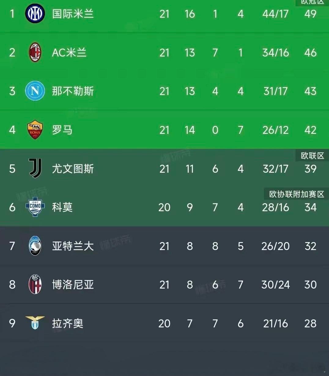 阿莱格里回归米兰后,率队在意甲20轮不败!米兰主场1-0胜莱切,紧追榜首的国米。罗马客场2-0胜都灵,把之前被卡利亚里爆冷的尤文挤出前四。一月赛程紧密,轮换对争冠和争四球队至关重要。国米近两轮均1-0取胜,齐沃临场调整有进步。接下来,米兰专注联赛,国米和那不勒斯受欧冠影响,尤其是国米,周中将战英超榜首阿森纳,拿分不易。不过,阿森纳周末将战换帅后击败曼城的曼联,且欧冠已提前晋级,周中可能大面积轮换。齐沃若想带队直接晋级16强,接下来两场需拿4分,国米必须全力争胜,但这对联赛不利。我认为国米应以联赛为重,欧冠尽力即可。恰尔汗奥卢和邓弗里斯两大主力受伤,齐沃带队多线作战难度大。足球意甲国米