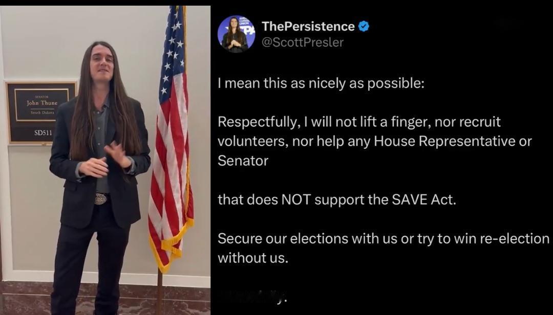 🚨最新消息:斯科特·普雷斯勒宣布,在2026年中期选举中,任何拒绝支持《保障选举法案》(SAVE Act)的众议院或参议院共和党人,他都将放弃支持。该法案要求选民必须出示公民身份证明和身份证才能投票。 “要么和我们一起保障选举安全,要么就别想在我们之外赢得连任。” 🔥 很难通过,别找借口! @ScottPresler 还亲自前往参议员约翰·图恩的办公室,要求就《保障选举法案》进行投票表决。 继续!🇺🇸 🚨 JUST IN: Scott Presler announces he will ABANDON any House or Senate Republican in the 2026 midterms who refuses to support the SAVE Act, that would require citizenship and ID to vote "Secure our elections with us or try to win reelection without us." 🔥 PASS IT NOW, NO EXCUSES! @ScottPresler also personally went to Sen. John Thune's office and asked for the SAVE Act to be brought to a vote. Keep pushing! 🇺🇸