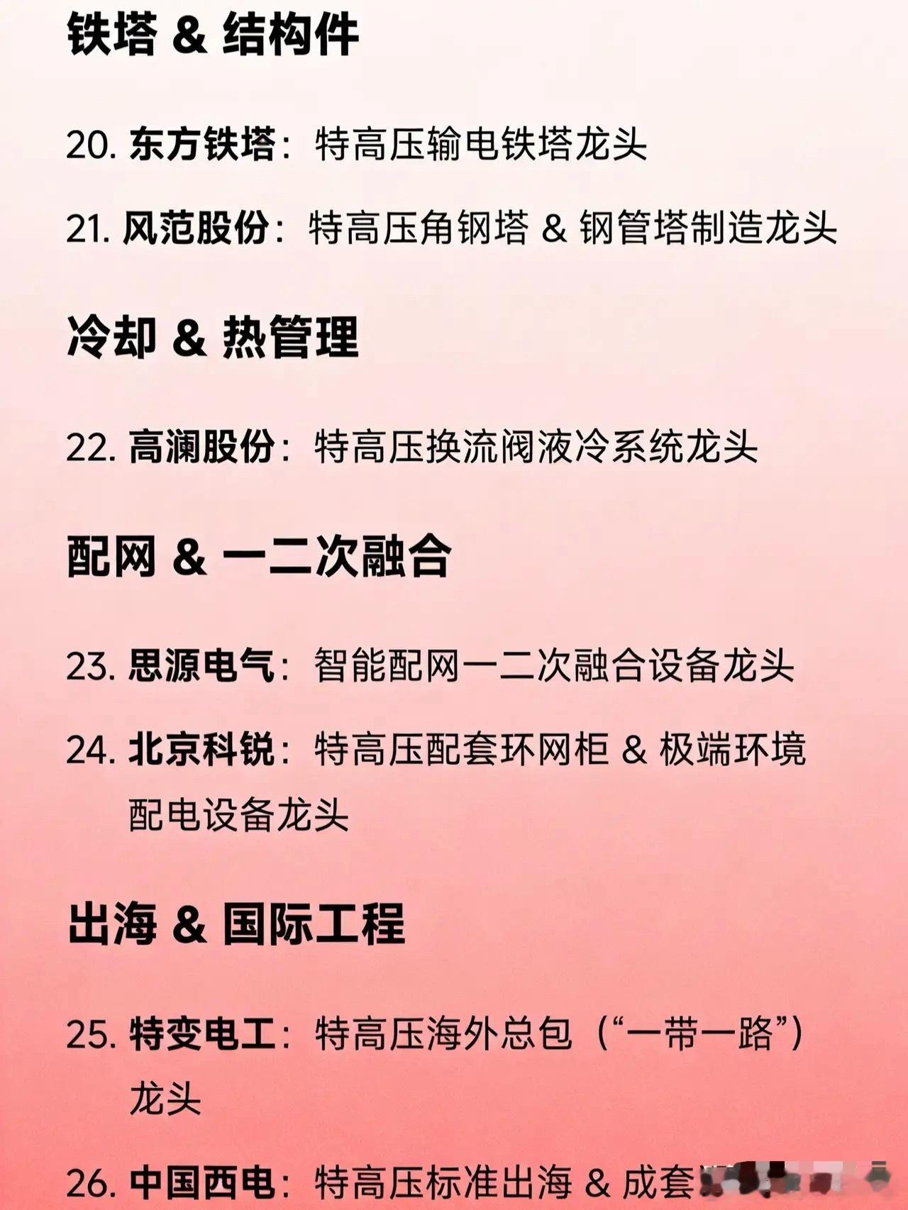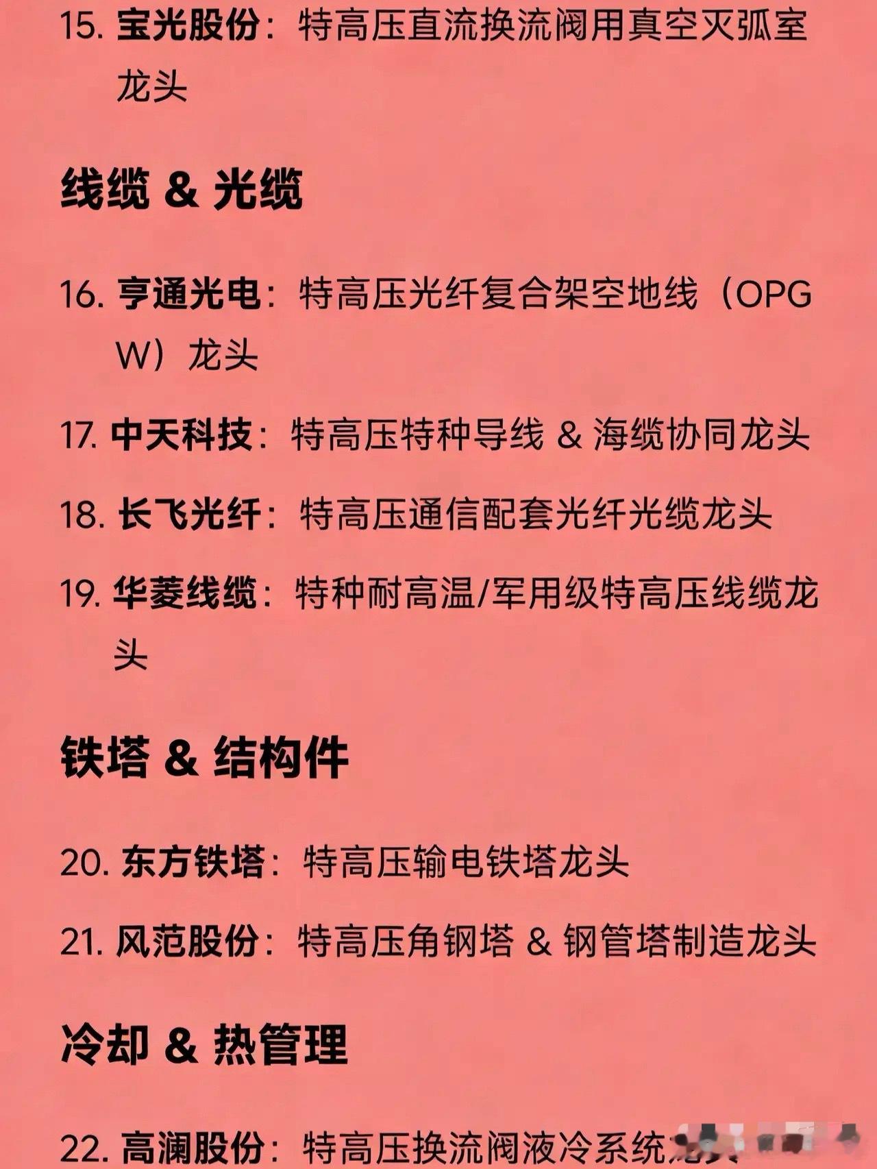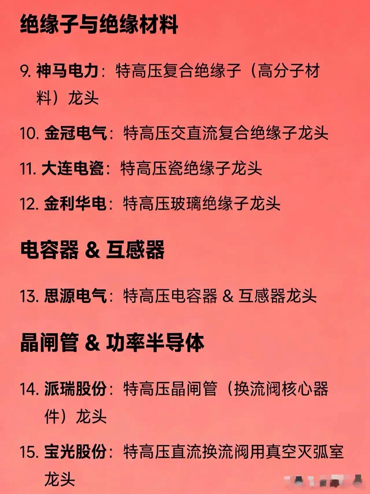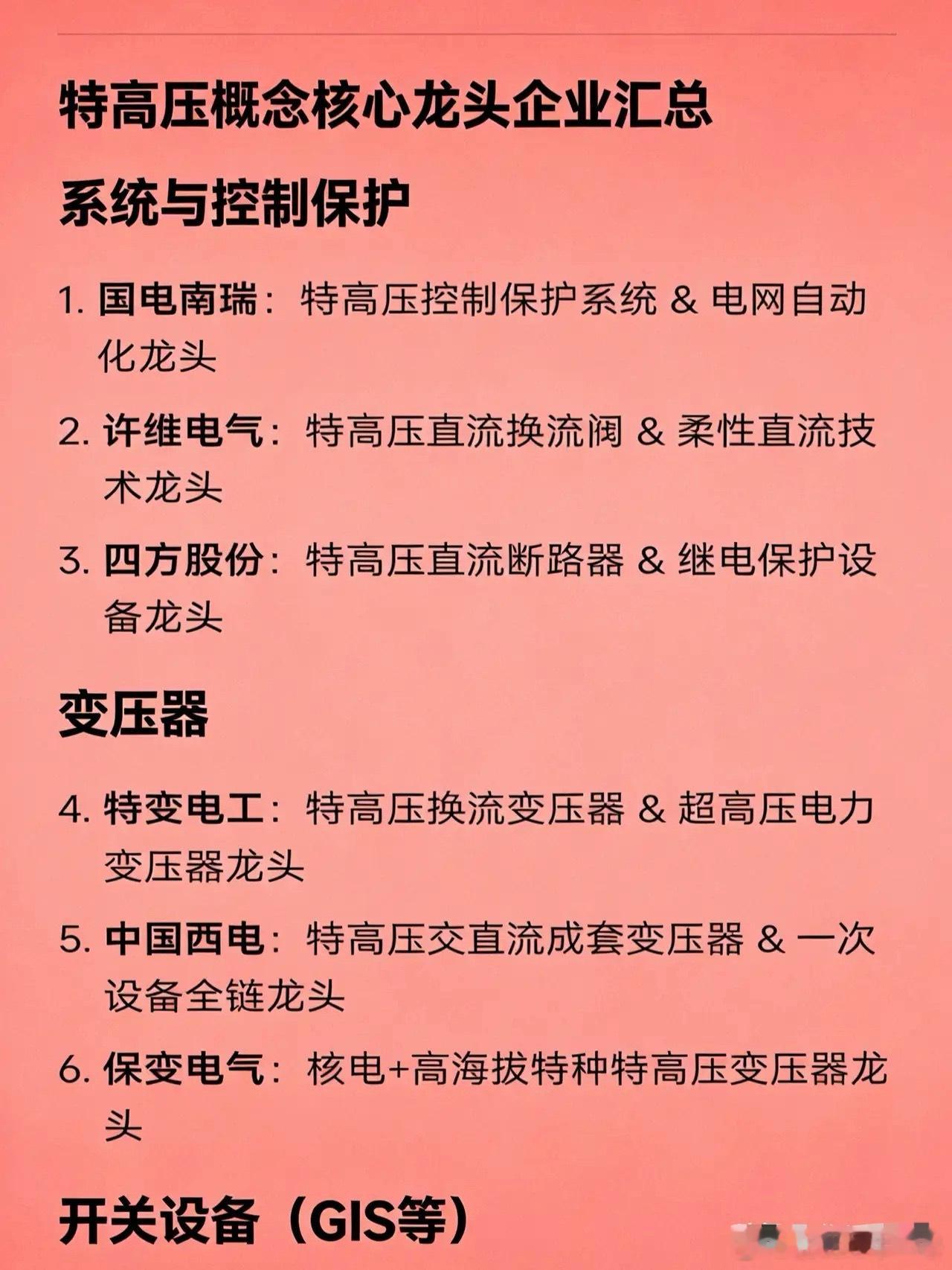 特高压概念核心龙头企业汇总系统与控制保护国电南瑞:特高压控制保护系统 & 电网自动化龙头许继电气:特高压直流换流阀 & 柔性直流技术龙头四方股份:特高压直流断路器 & 继电保护设备龙头变压器特变电工:特高压换流变压器 & 超高压电力变压器龙头中国西电:特高压交直流成套变压器 & 一次设备全链龙头保变电气:核电+高海拔特种特高压变压器龙头开关设备(GIS等)平高电气:特高压GIS(气体绝缘开关)龙头中国西电:特高压断路器 & 开关成套设备龙头绝缘子与绝缘材料神马电力:特高压复合绝缘子(高分子材料)龙头金冠电气:特高压交直流复合绝缘子龙头大连电瓷:特高压瓷绝缘子龙头金利华电:特高压玻璃绝缘子龙头电容器 & 互感器思源电气:特高压电容器 & 互感器龙头晶闸管 & 功率半导体派瑞股份:特高压晶闸管(换流阀核心器件)龙头宝光股份:特高压直流换流阀用真空灭弧室龙头线缆 & 光缆亨通光电:特高压光纤复合架空地线(OPGW)龙头中天科技:特高压特种导线 & 海缆协同龙头长飞光纤:特高压通信配套光纤光缆龙头华菱线缆:特种耐高温/军用级特高压线缆龙头铁塔 & 结构件东方铁塔:特高压输电铁塔龙头风范股份:特高压角钢塔 & 钢管塔制造龙头冷却 & 热管理高澜股份:特高压换流阀液冷系统龙头配网 & 一二次融合思源电气:智能配网一二次融合设备龙头北京科锐:特高压配套环网柜 & 极端环境配电设备龙头出海 & 国际工程特变电工:特高压海外总包(“一带一路”)龙头中国西电:特高压标准出海 & 成套设备出口龙头数字化 & AI调度国电南瑞:AI电网调度 & 数字孪生电网平台龙头柔性直流 & 新型输电许继电气:±800kV柔直换流阀技术龙头国电南瑞:柔性直流控制保护系统龙头综合央企平台中国电气装备集团(旗下含中国西电、平高、许继等):国家特高压“国家队”集成平台龙头
