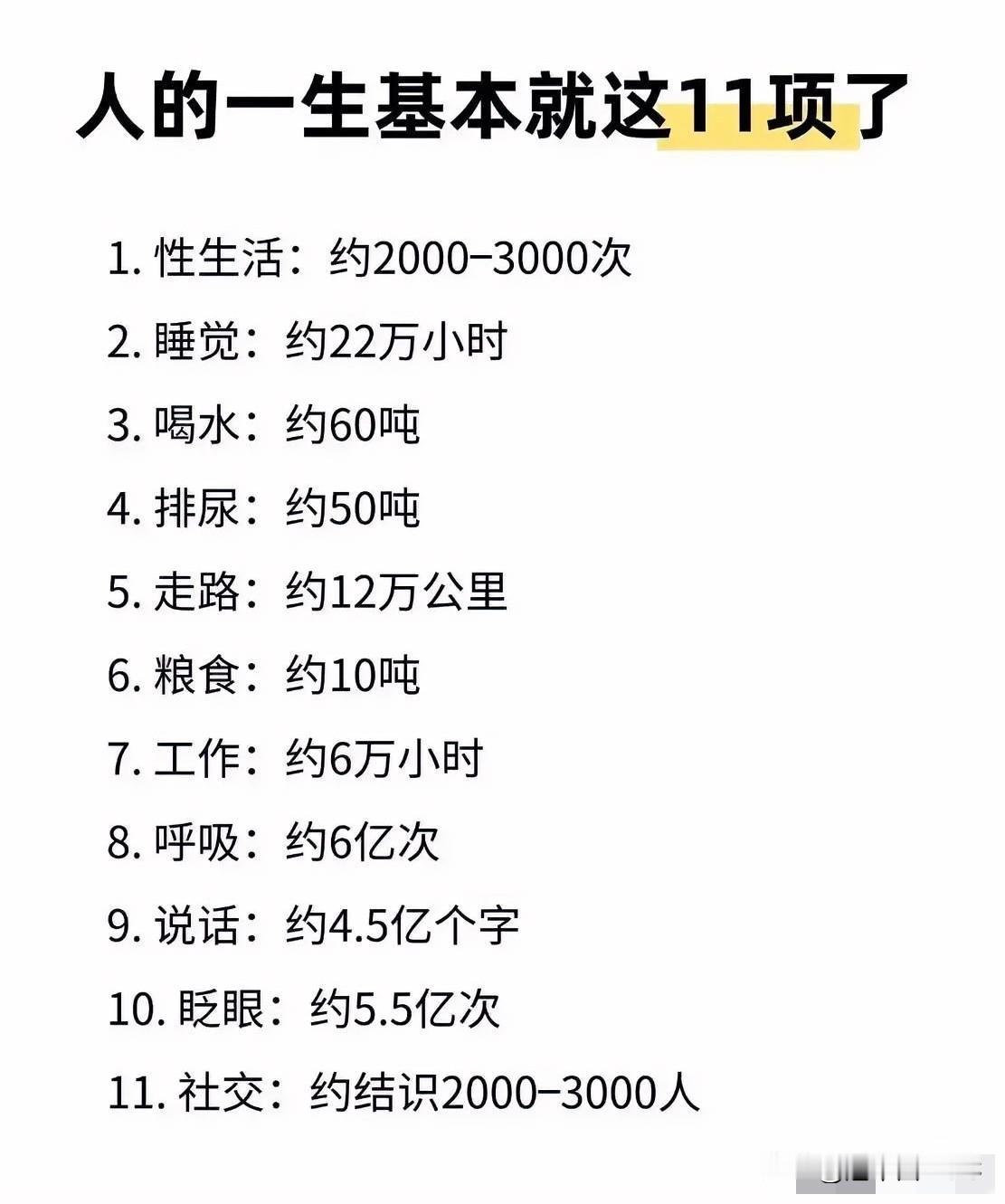 1990年出生,今年就是36岁。按平均寿命78岁算,人生进度条,快走完一半了。 咱来算算这笔“人生账”。 睡觉,22万小时的总量,你已经睡掉了大约11.88万小时,剩下一半不到的觉,不到10万小时了。 工作,6万小时的总时长。假设22岁工作到60岁,你已工作14年,用掉了大约2.1万小时。剩下的24年,满打满算也只有不到4万小时的工作时间了。 那些日常消耗,更是触目惊心。喝水60吨,你已经喝了大约28吨;吃饭10吨,你已经吃了快5吨。呼吸和眨眼这种每秒都在进行的,进度条更是悄无声息地走过了一半。 最扎心的可能是性生活和社交。2000-3000次的额度,年轻时可能用得多,中年后频率自然下降,或许额度已用了大半。而认识2000-3000人,36岁的你,通讯录里早已塞满了人,但往后真心能结识的新朋友,恐怕会越来越少。 这么一算,是不是后背发凉?我们总以为未来很长,但把这些宏大的数字,拆解成已经用完的“一半”,才惊觉时光是个多么迅速的“吞金兽”。 但账不能只这么算。正因为知道了余额,才知道不能乱花。剩下的饭,要好好品尝;剩下的路,要和喜欢的人一起走;剩下的“工作小时”,要尽量做点自己认可的事。 人生不是倒计时,而是余额提醒。看清它,然后,更珍惜地去用。共勉。