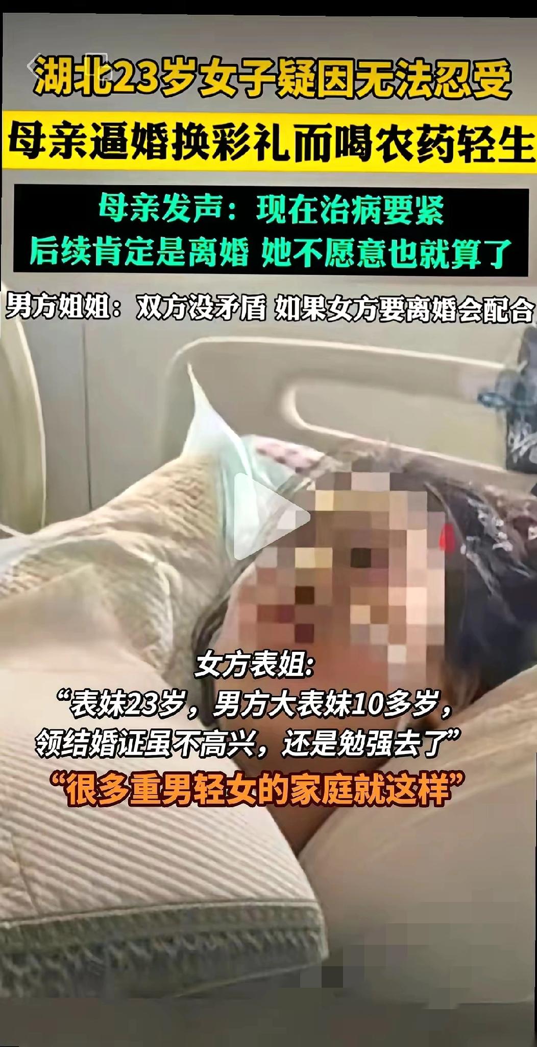 湖北仙桃23岁的谢贝贝,没等到新婚的红烛,却栽在了亲妈逼婚的算计里。 她攥在手里的不是喜糖,是瓶2.54元的农药,吞下的是对这场“交易婚姻”的绝望。 母亲把她推给大十岁的远亲,见面没几天就催着领证,她攒的辛苦钱被借走买房,以为的婚姻承诺也没兑现。 最戳心的不是逼婚本身,是有些父母把生养当成“投资”,把女儿的婚姻当成“回本生意”。 他们嘴里的“为你好”,藏的全是算计,却忘了孩子是活生生的人,不是用来换利益的工具。 万幸谢贝贝最终清醒脱险,妇联也介入援助,但这场悲剧早该敲响警钟:亲情不该是绑架的枷锁,婚姻更不是利益交换的筹码。 你觉得彩礼和逼婚,哪个才是摧毁女孩幸福的关键?