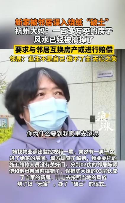 1月17日,浙江,一女子刚进入新房,就发现屋里竟然有一堆烧过的“纸灰”,之后果断报警,一查才知道做这事的居然是邻居!女子觉得屋子里烧过“元宝”,已经不能住人了,随即向邻居索赔,却遭到了邻居的拒绝。 1月17号,杭州的陈女士来到自己的新房门口,这新房她花了一百多万买下来,今天是去看看装修的怎么样了,没曾想刚到门口就发现自己家新房的门是开着的。 这让陈女士倍感不妙,一推开门就发现房子的地上散落着黑乎乎的纸灰,墙角堆着几撮没烧干净的元宝碎片。 陈女士当时气得手都抖了,她赶紧掏出手机,对着屋里的狼藉一阵拍照录像,连角落的纸灰痕迹都没放过。好好的新房,自己还没正式入住,怎么就有人闯进来烧纸了? 陈女士赶紧联系物业调监控,监控视频显示物业委托的施工维修人员没有把门关好,一男一女见门没关,便鬼鬼祟祟的进到陈女士的家里。 两人拎着香烛和一沓黄纸,进屋后没多久就有烟雾飘了出来,大约半小时后才离开。 这监控视频陈女士真是越看越气,当即是报了警,顺着监控线索一查,民警很快找到了当事人,竟然是住在对门的邻居陈师傅和他母亲。 找上门的时候,陈师傅一家也挺意外,陈师傅连忙解释,这纯属无心之失。原来两家都是长山头村的回迁户,新房门牌号挨着,02 户和 03 户的门长得几乎一样。 他母亲年纪大了,对小区布局还不熟悉,老人家记错了门牌号,以为陈女士家是自家还没收拾的新房,就想着按老规矩办个 “破土” 仪式。 “我们老家都兴这个,新房装修完要烧点元宝纸钱,祭拜土地公,祈求家宅平安,” 陈师傅一脸无奈,“我妈也是一片好心,没想到认错了门,而且这房子的业主是我儿子,我也做不了主啊。” 可陈女士根本听不进去这话,她指着屋里的纸灰,直言:“我这房子一百多万买的,特意请风水先生看过,说要按步骤办‘净房’‘安方’仪式,才能聚气旺宅。现在你们在屋里烧纸‘破土’,等于把我家的风水全搞掉了,这房子我怎么住?” 她提出要么两家互换房产,要么邻居给出合理赔偿,看邻居经济条件不太好的样子,也就赔偿几万块就可以了。 但这个要求被陈师傅一口拒绝了。“互换房产根本不可能,房子是我儿子的,我没这个权利。再说我们就是无心之失,也不是故意的,顶多帮你把屋子打扫干净,赔偿实在谈不拢。” 双方各执一词,吵得不可开交,陈女士觉得邻居毫无诚意,邻居觉得陈女士小题大做,事情就这么僵住了。 小区物业也被卷了进来,陈大姐认为,物业没管好临时钥匙,也没做好门禁管理,才让邻居能轻易误入自家,物业也得担责任。 1月19号,村委会的工作人员和物业一起,把双方请到了社区调解室, 陈师傅则一个劲地道歉,说确实是自己母亲的疏忽,愿意承担清洁和部分补偿,但实在拿不出太多钱。 调解人员先耐心听了双方的诉求,然后从情理和实际出发慢慢劝说。 他们告诉陈师傅,不管是不是故意的,私自进入他人房屋烧纸,确实侵犯了他人的住宅安宁权,也造成了心理困扰,适当赔偿是应该的。 经过两个多小时的沟通,双方终于达成了一致。陈师傅一方当场向陈大姐诚恳道歉,赔偿 3000 元作为清洁费和精神补偿,这笔钱陈大姐打算用来请专业人员做深度清洁。 物业也承诺,之后会加强小区钥匙管理和门禁巡查,避免类似情况再次发生,还会给陈大姐减免一个月的物业费作为补偿。 邻里相处,既要尊重彼此的习俗,也要多一份细心和体谅,遇到问题好好沟通,才能让住得舒心。 对于这件事,您有什么想说的吗?欢迎评论区留言讨论。 信源:浪涨新闻2026-01-19——《新家被邻居误入烧纸"破土"杭州大妈:一百多万买的房子风水已经被搞掉了要求与邻居互换房产或进行赔偿…》