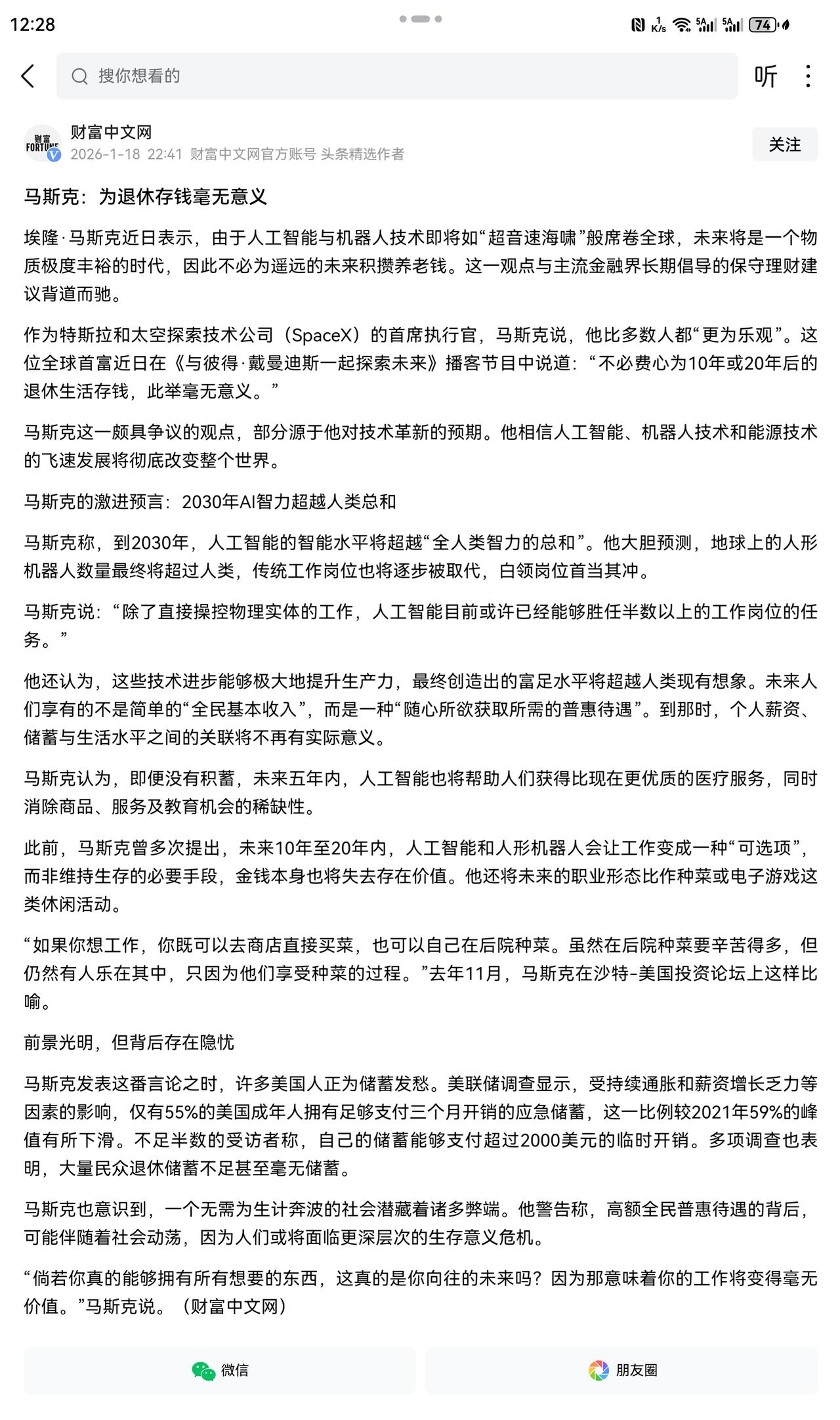 普通人不需要再攒养老金?马斯克的话听听就好。 刚刷到马斯克又爆金句,说AI和机器人马上要整出“超音速海啸”,以后物质多到用不完,存退休金纯属白给。忽然想到前几天九边发的一篇文章观点类似,伴随着机器人和AI的发展,机器人替代了普通人,普通人何去何从? 然而如果你认真思考一下,就会觉得马斯克的论点无法成立,从第一次工业革命至今已经这么多年了,生产力提升了多少倍了,但是工人和农民实现富裕了吗?即便真按他说的“物质无限”,那第一定律肯定是无限的物质,优先流向产生他们的人,而不会流向非洲难民。 其实马斯克自己也虚,他说人人躺平的世界会有生存意义危机。翻译一下:当我公司的机器人养活全人类时,你们这些“被养活”的精神状态我不负责啊。这不就是科幻片老套路——精英在飞船里规划人类未来,平民在营养舱里沉迷虚拟快乐? 应当注意,技术能冲破稀缺,但冲不破私有制的结界。技术可以极大解放和发展生产力,也许是我们通往共产主义的路径,然而生产力极高、物质极为丰富只是共产主义的基础,还需要调整生产关系和资产分配,实现按需分配。 马斯克的话听听就好,希望我们能赶上共产主义的头班车,但是目前还是继续攒养老金吧。