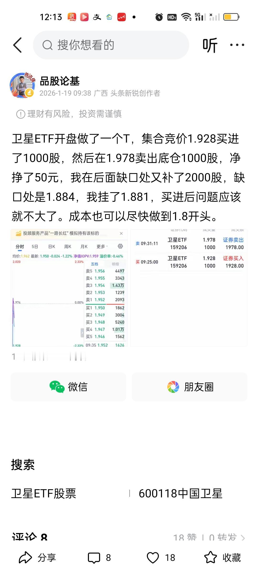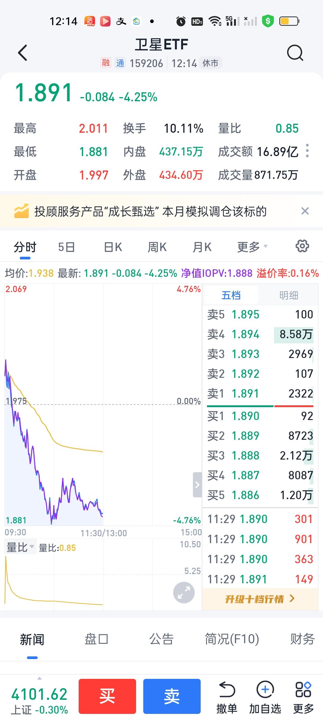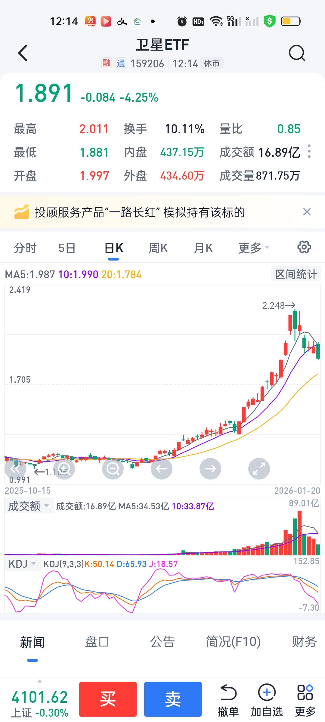大家都知道卫星ETF我讲了不下20遍,下方缺口1.884-1.910是必补的,可是又有几个人肯相信?今天最低点来到1.881,是不是和我说的点位分文不差? 这个地方你不要害怕啊。前高2.248后期是必破的,你能把成本做到1.800,甚至1.600那不是很好吗?1.800/2.248=0.800,这个位置刚好是前面高点下来跌了20%的位置,假设后面来到2.500,2.500/1.800=1.3888,也最少有38.88%的利润。这个地方不需要害怕了。稳稳拿住就可以了。