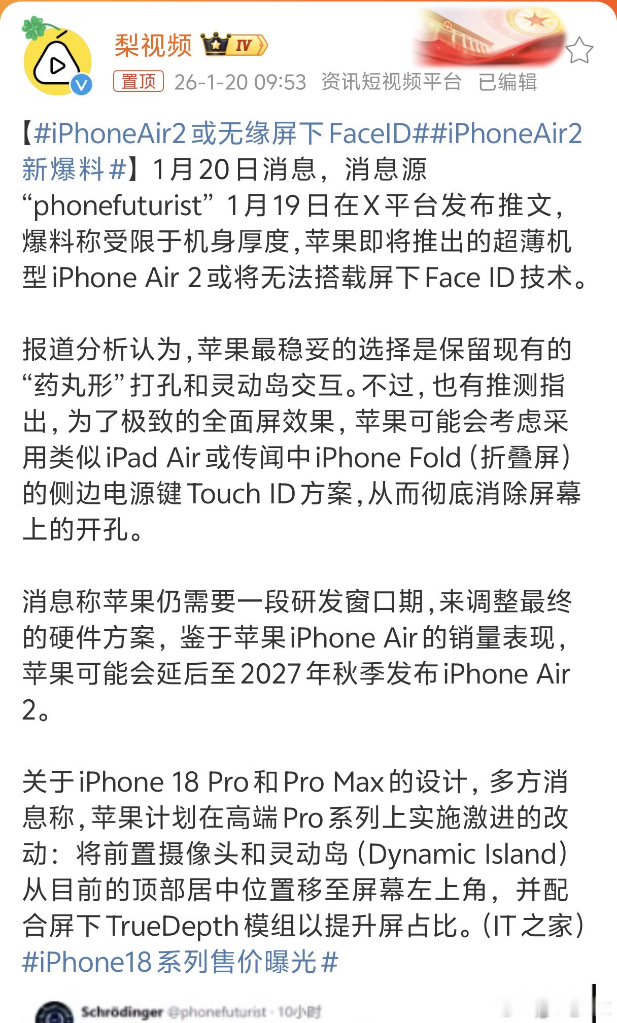 iPhoneAir2新爆料苹果这是爆料不断,即iPhone18Pro之后iP