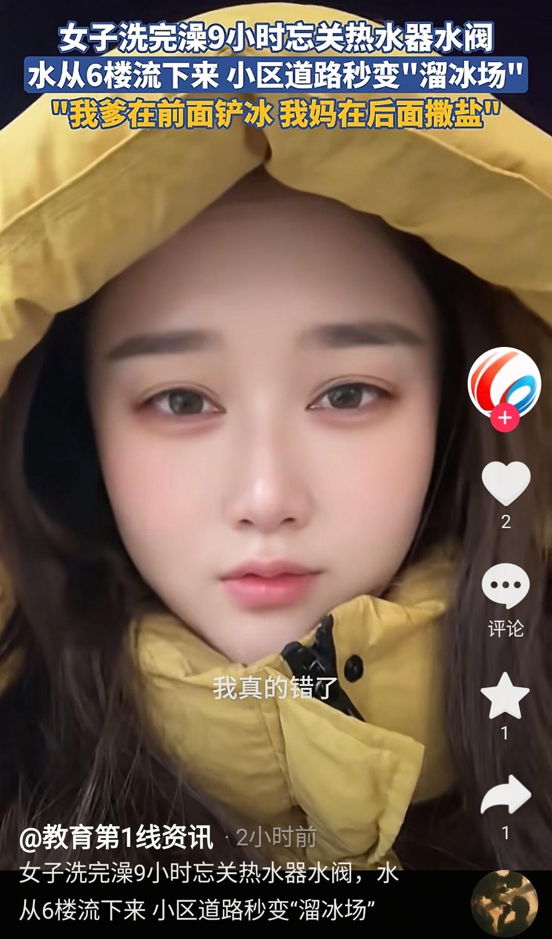 这位甘肃姑娘,娄子捅大了!洗完澡,忘关热水器水阀,整整9小时,结果水从6楼淌到了小区,小区道路冻成了“溜冰场”,害得爸妈凌晨五点就下楼铲冰撒盐,还把小卖部的盐全买空了! 看得人又好气又好笑。 事发前夜,甘肃兰州的王女士舒舒服服洗完澡,随手拧了下热水器水阀就转身忙活别的事,压根没确认阀门是否关紧。当晚气温低至-13℃,汩汩热水顺着6楼外墙往下淌,先是浸湿了楼体墙面,慢慢凝结成冰挂,随后水流越积越多,沿着单元门口蔓延到小区主干道,一夜之间,平整的柏油路就变成了溜滑的冰面。 这一切发生得悄无声息。 直到次日凌晨5点多,王女士的父亲像往常一样早起准备晨跑,刚踏出单元门就脚下一滑,险些摔个正着。低头一看,地面泛着一层亮晃晃的冰光,还有细流在冰面缝隙里缓缓涌动,抬头再瞧,自家6楼的窗台外还在往下滴水。 谁能想到,一个没拧紧的水阀,竟惹出这么大的麻烦。 王父赶紧跑回家喊人,等王女士和母亲匆匆下楼时,小区里已经陆续有早起的居民出门,有人拎着菜篮子小心翼翼挪步,有人推着自行车在冰面上打滑,还有送孩子上学的家长,只能牵着孩子的手慢慢蹭着走,生怕一个趔趄摔在冰上。 王女士看着眼前的景象,又羞又愧,眼眶瞬间就红了。 来不及多想,一家人立刻投入“破冰行动”,王父扛着铁锹冲在前面,一锹锹砸向坚硬的冰面,冰碴溅得满身都是,手套很快就被寒气浸透;王母紧随其后,手里捧着从小区小卖部买来的大包食盐,一把把均匀撒在铲开的冰面上,为了加快融冰速度,他们干脆把小卖部货架上的盐全买空了;王女士也拿着扫帚,一边清扫碎冰,一边对着路过的邻居连声道歉。 “真的对不起大家!是我太粗心了,害得大家出门都不方便!”王女士红着眼眶跟每一位路过的居民致歉,连没买到盐的住户都没落下,“尤其是那些打算腌菜的叔叔阿姨,实在对不住!”她坦言,自己已经被父亲狠狠批评了一顿,父亲还臊得直说:“丢不起这人”。 物业也很快赶到现场,第一时间关闭了单元总水阀,又在冰面周边摆上警示标志,提醒过往居民注意安全。 邻居们看着一家人忙前忙后的身影,也没过多抱怨,还有人在小区群里调侃:“这纯天然溜冰场,就是太费盐了!” 直到中午时分,在一家人的努力和物业的协助下,小区道路上的冰面才被彻底清理干净,所幸这场意外没有造成人员受伤。 古人常说“千里之堤,溃于蚁穴”,幸好这场意外最终有惊无险,没有造成人员摔伤的严重后果,否则王女士一家面临的就不只是邻里歉意和铲冰撒盐的劳累,还有可能是一笔笔赔偿和甩不开的责任包袱。 就像这次的事件,若是夜间有老人起夜路过冰面,或是有骑车上班的年轻人没注意滑倒,后果不堪设想。 而王女士一家后续的补救行为,倒是值得称赞,发现问题后没有逃避,父母带头铲冰撒盐,女儿主动道歉。 其实想要避免这类疏忽,完全可以用一些接地气的小办法,不用搞复杂的安全方案。 比如,在厨房、卫生间的水电开关旁贴个便签,写上“关水!”“断电!”的提醒;洗完澡、做完饭后,花10秒钟养成回头看一眼的习惯,检查阀门、开关是否到位;冬季气温低的日子,睡前可以专门花两分钟巡个房,看看水管有没有漏水、窗户有没有关严。 另外,家里的老人和孩子也可以互相提醒,毕竟多一双眼睛,就能少一份隐患。